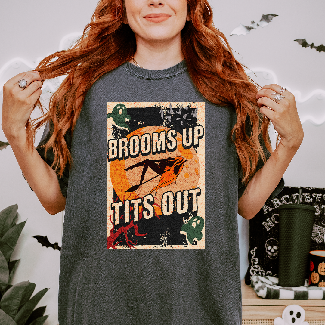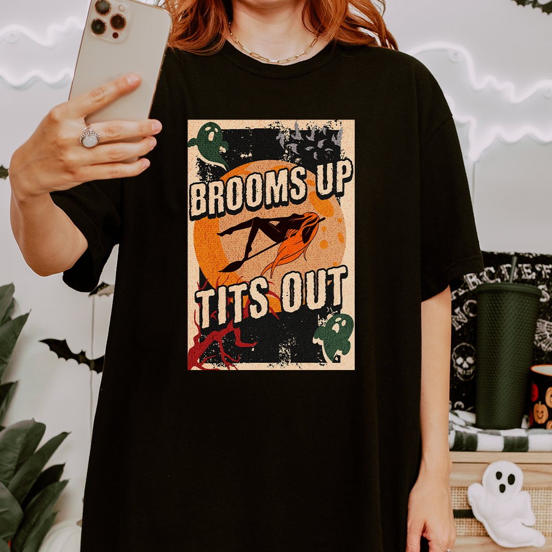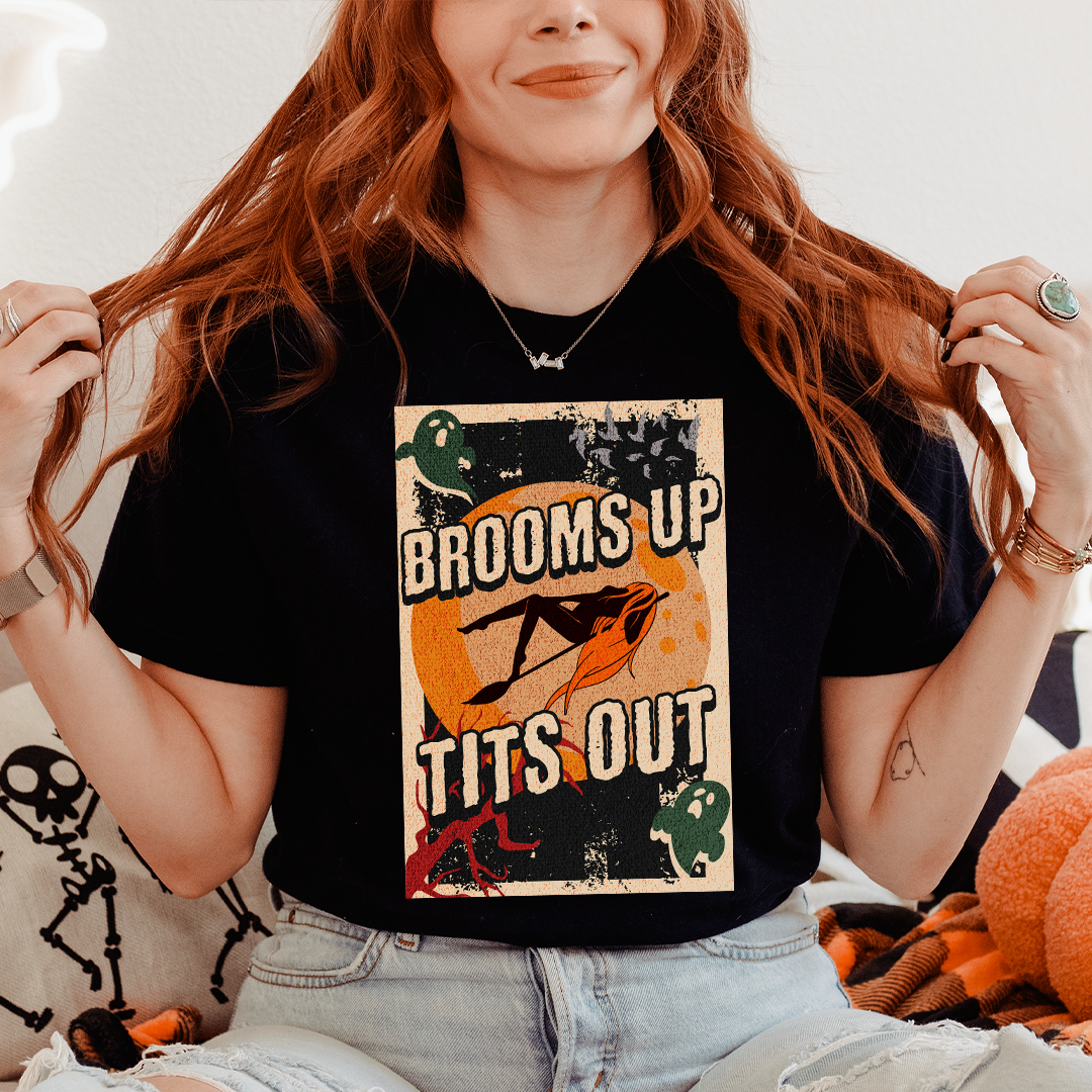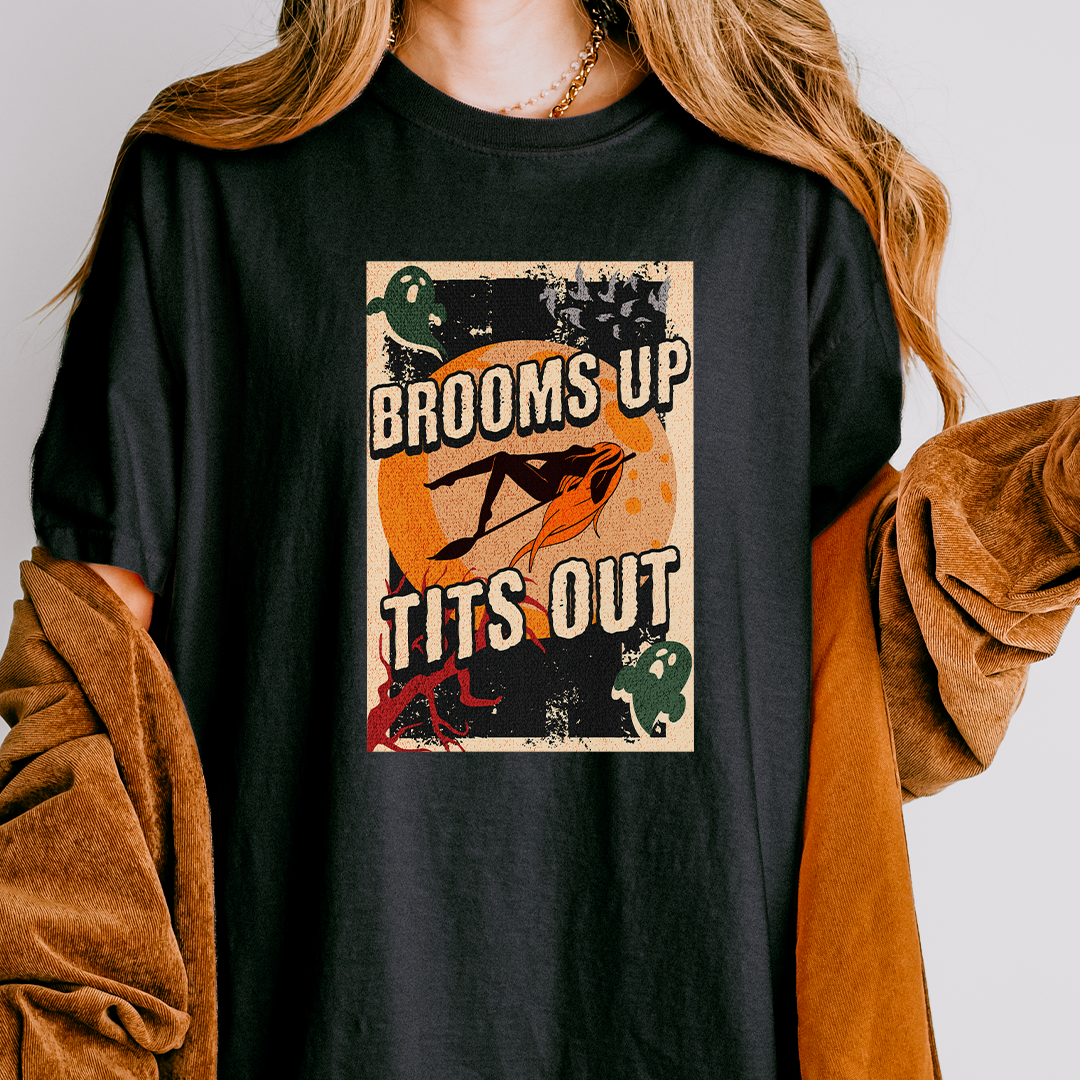 Embrace your wicked side with this cheeky "Brooms Up, Tits Out" Halloween t-shirt! Perfect for those who love to push the boundaries and add a little humor to the spooky season, this retro-style design features a witch flying against the moon with bold, edgy text that’s sure to make a statement.