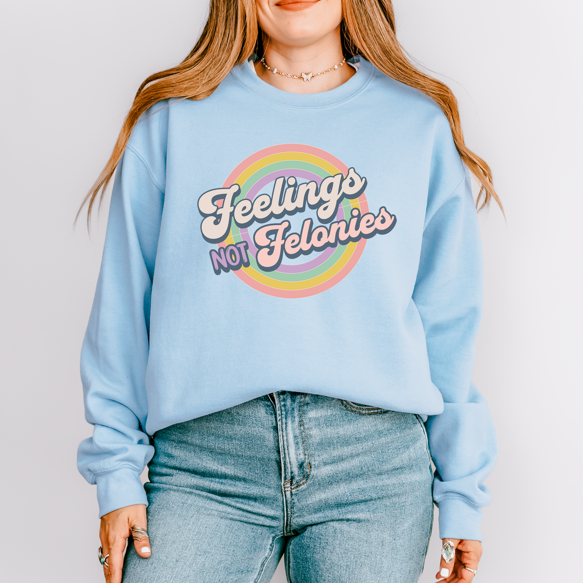 Feel stylish and spread positivity with this retro-inspired "Feelings Not Felonies" sweatshirt! Featuring a colorful pastel rainbow design and a fun message that encourages emotional awareness, this cozy crewneck is perfect for anyone who believes in embracing their feelings. It's an ideal gift for friends, family, or yourself, whether you're lounging at home, running errands, or making a bold statement.