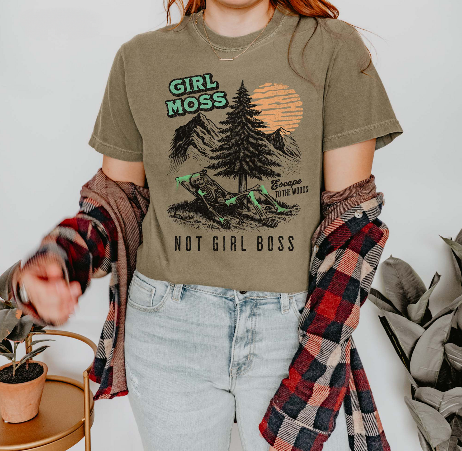 For the nature lover who dreams of escaping to the woods, this "Girl Moss" t-shirt is perfect! A clever play on the “Girl Boss” trend, this design embraces the idea of slowing down, getting away from the hustle, and reconnecting with nature. Featuring a vintage-inspired sunset and mossy elements, this tee is great for anyone who enjoys a bit of peace and humor in their wardrobe.