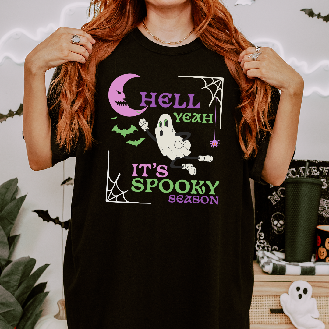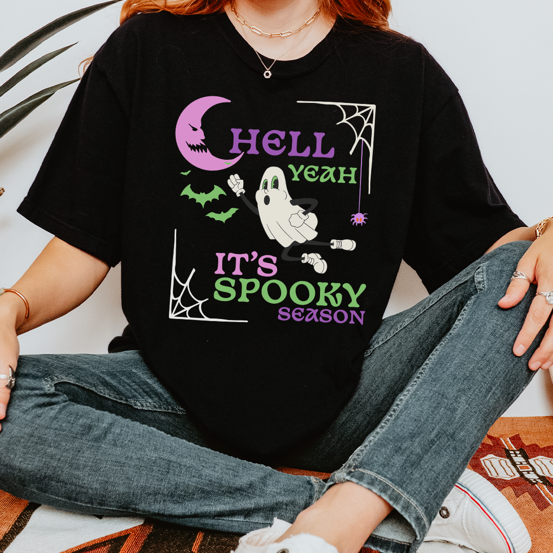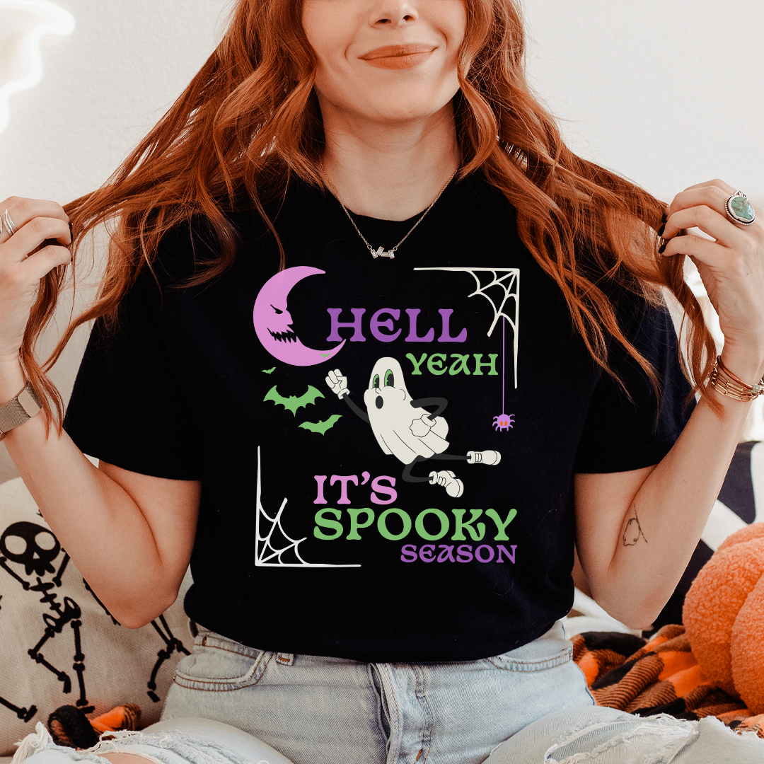 Get into the Halloween spirit with this fun and playful "Hell Yeah It’s Spooky Season" t-shirt! Featuring a cute yet determined little ghost and retro-style typography, this design is perfect for anyone who loves the spooky season and isn’t afraid to show it. Whether you’re gearing up for Halloween parties, pumpkin carving, or cozying up with some horror movies, this t-shirt brings the spooky vibes with a touch of humor.