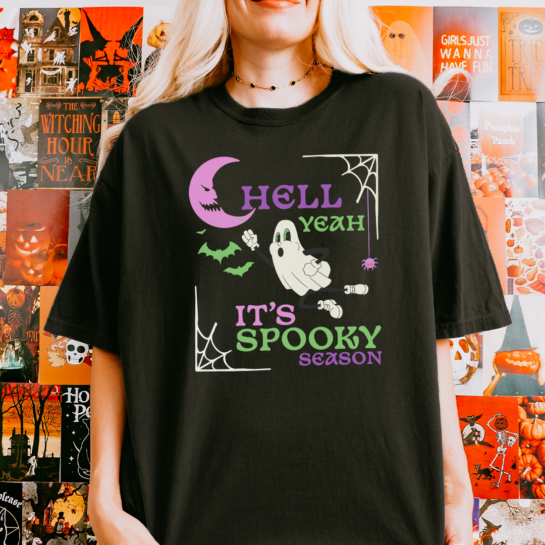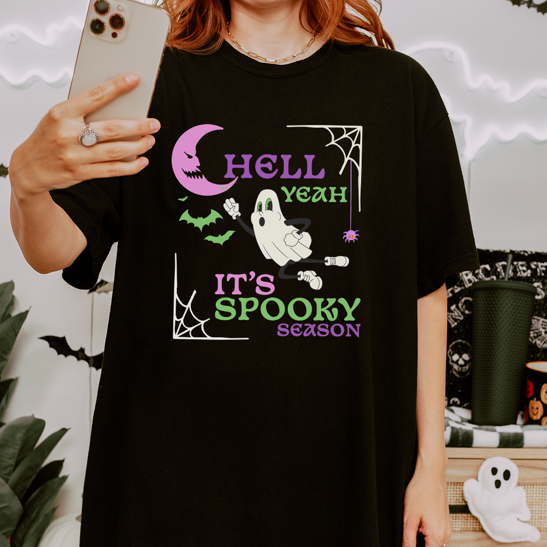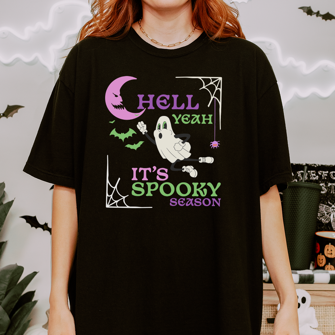 Get into the Halloween spirit with this fun and playful "Hell Yeah It’s Spooky Season" t-shirt! Featuring a cute yet determined little ghost and retro-style typography, this design is perfect for anyone who loves the spooky season and isn’t afraid to show it. Whether you’re gearing up for Halloween parties, pumpkin carving, or cozying up with some horror movies, this t-shirt brings the spooky vibes with a touch of humor.