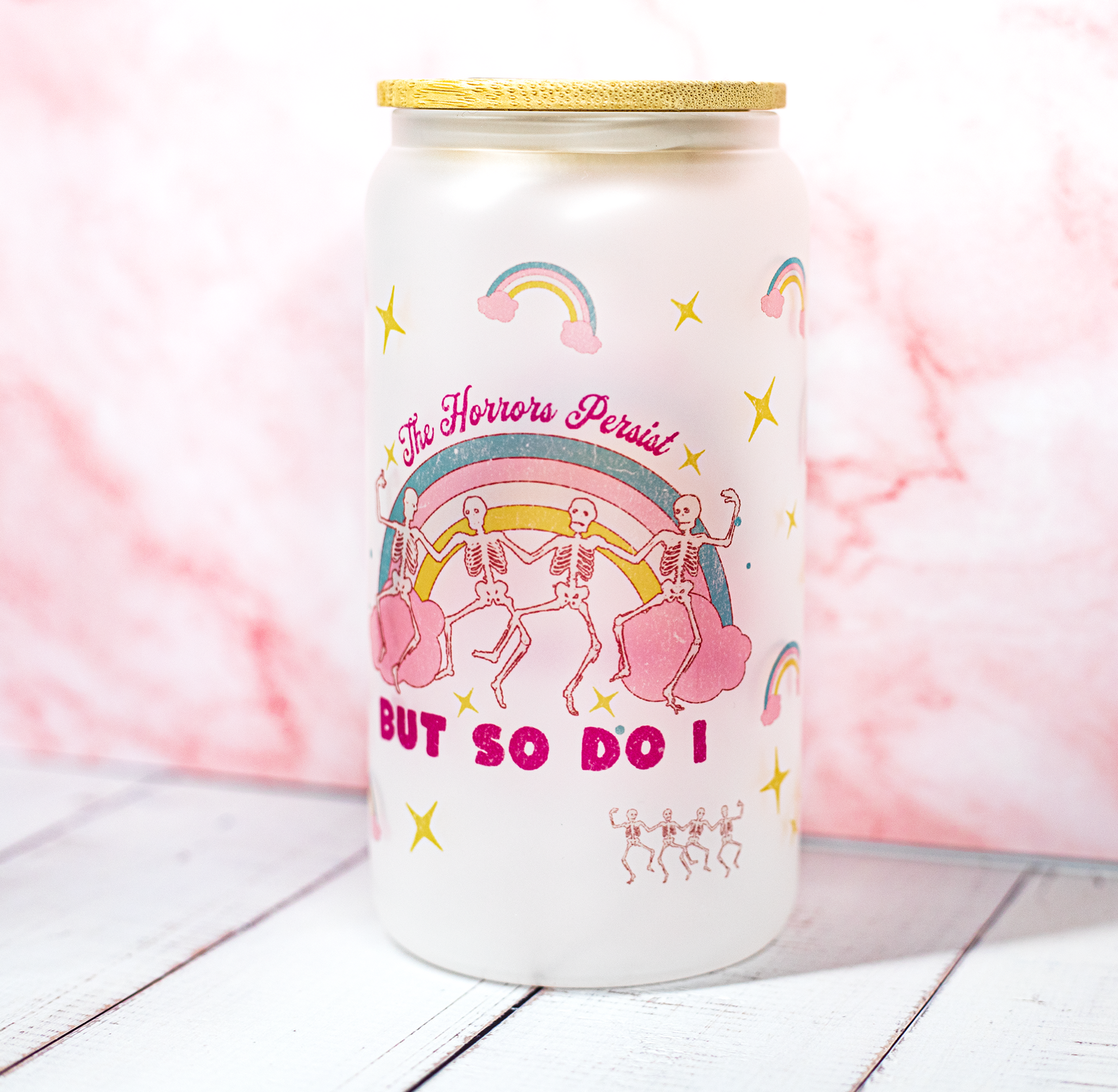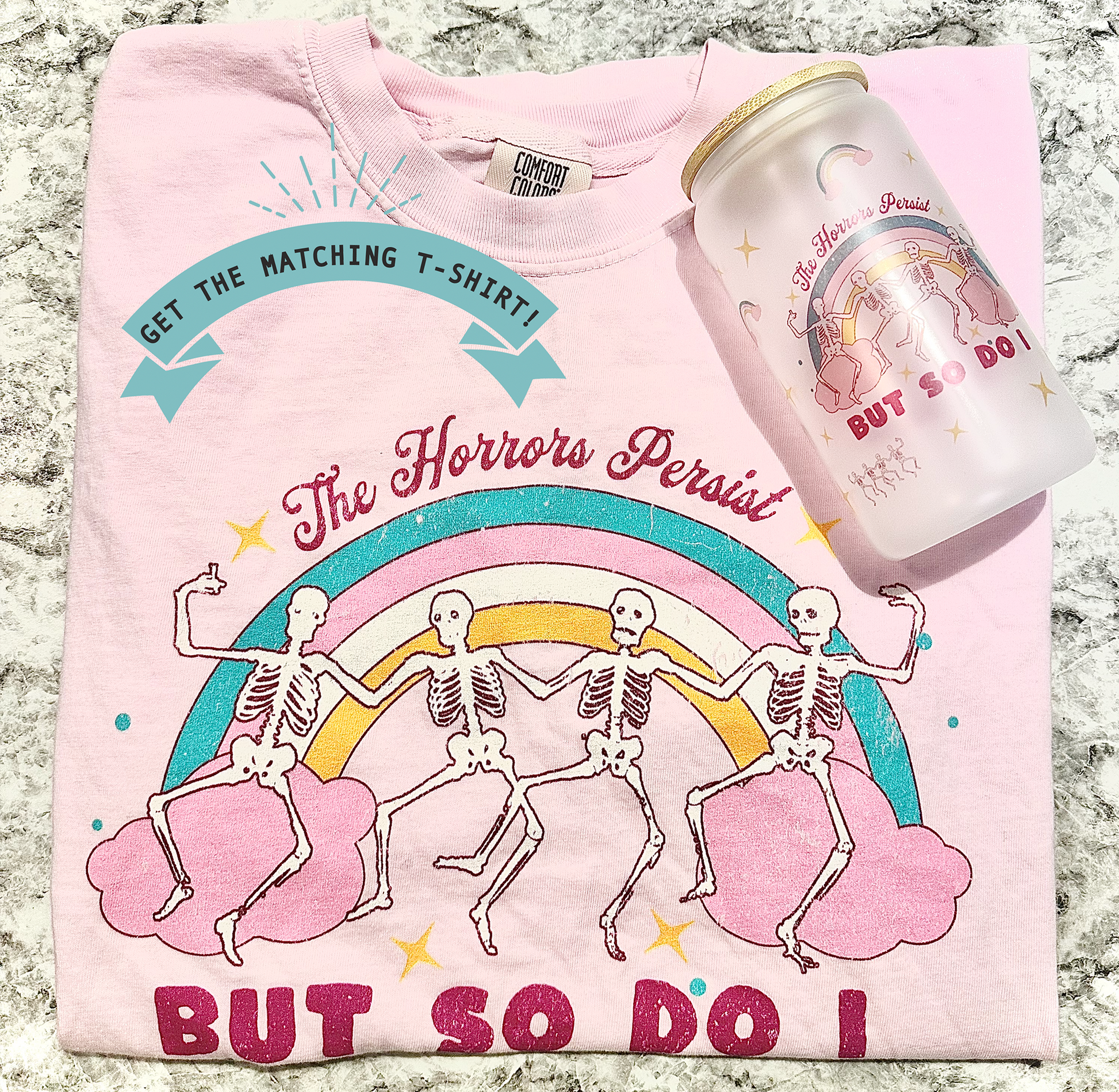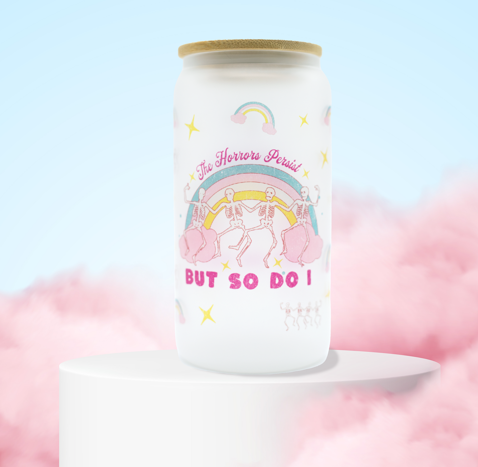 This playful design features the bold phrase "The Horrors Persist, But So Do I," accompanied by dancing skeletons, bright rainbows, and vibrant stars. Whether you’re sipping iced coffee, tea, or your favorite brew, this frosted glass beer can adds a quirky, retro-inspired aesthetic to any drink. The whimsical skeleton and rainbow design makes it the perfect choice for anyone who loves dark humor and a bit of flair with their beverage.