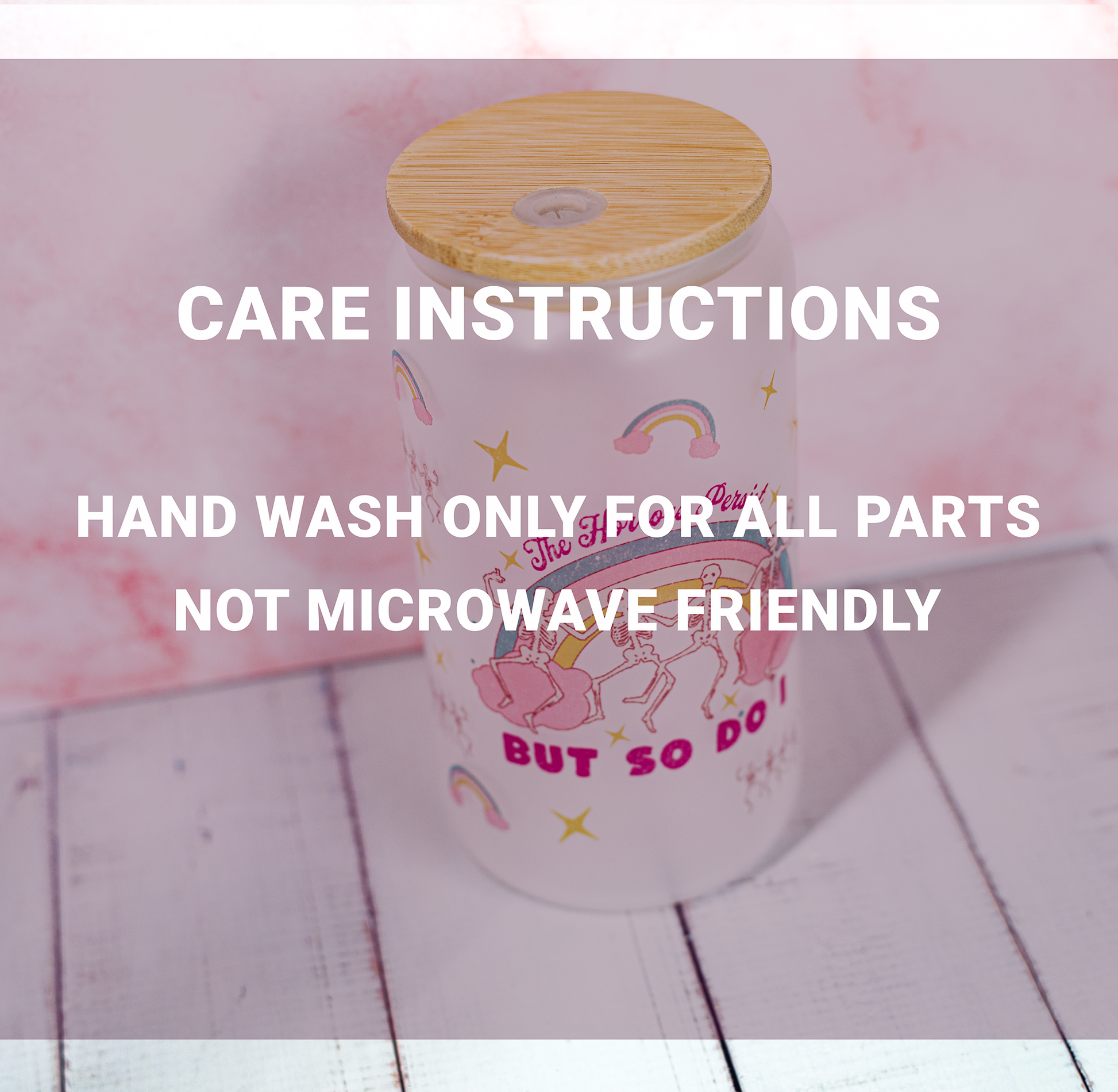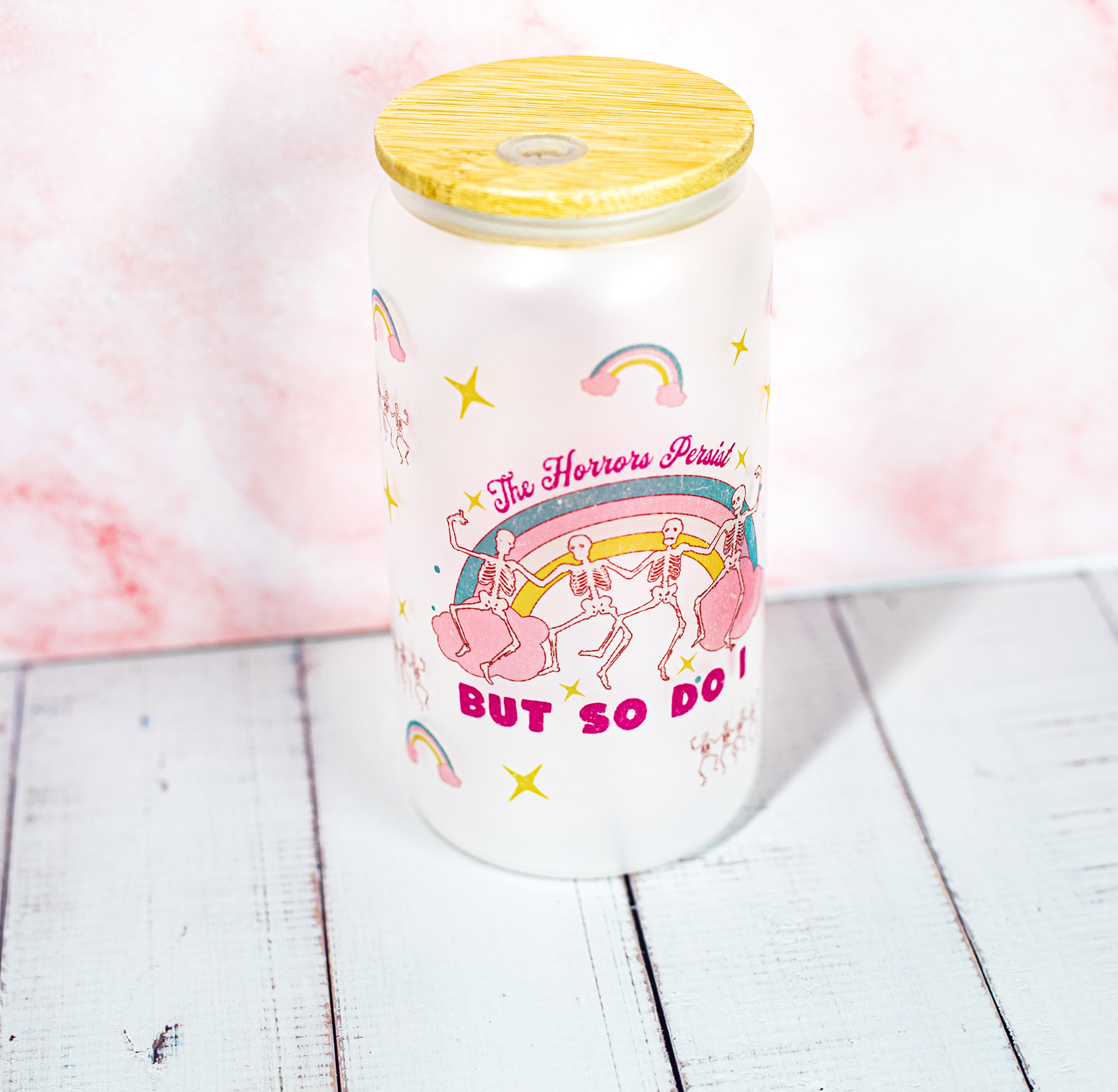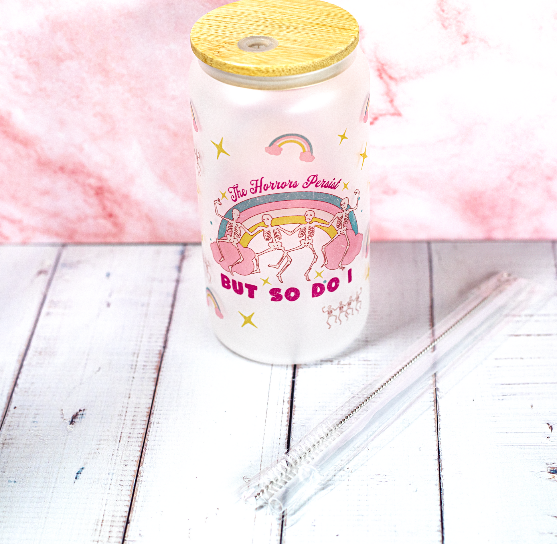 This playful design features the bold phrase "The Horrors Persist, But So Do I," accompanied by dancing skeletons, bright rainbows, and vibrant stars. Whether you’re sipping iced coffee, tea, or your favorite brew, this frosted glass beer can adds a quirky, retro-inspired aesthetic to any drink. The whimsical skeleton and rainbow design makes it the perfect choice for anyone who loves dark humor and a bit of flair with their beverage.