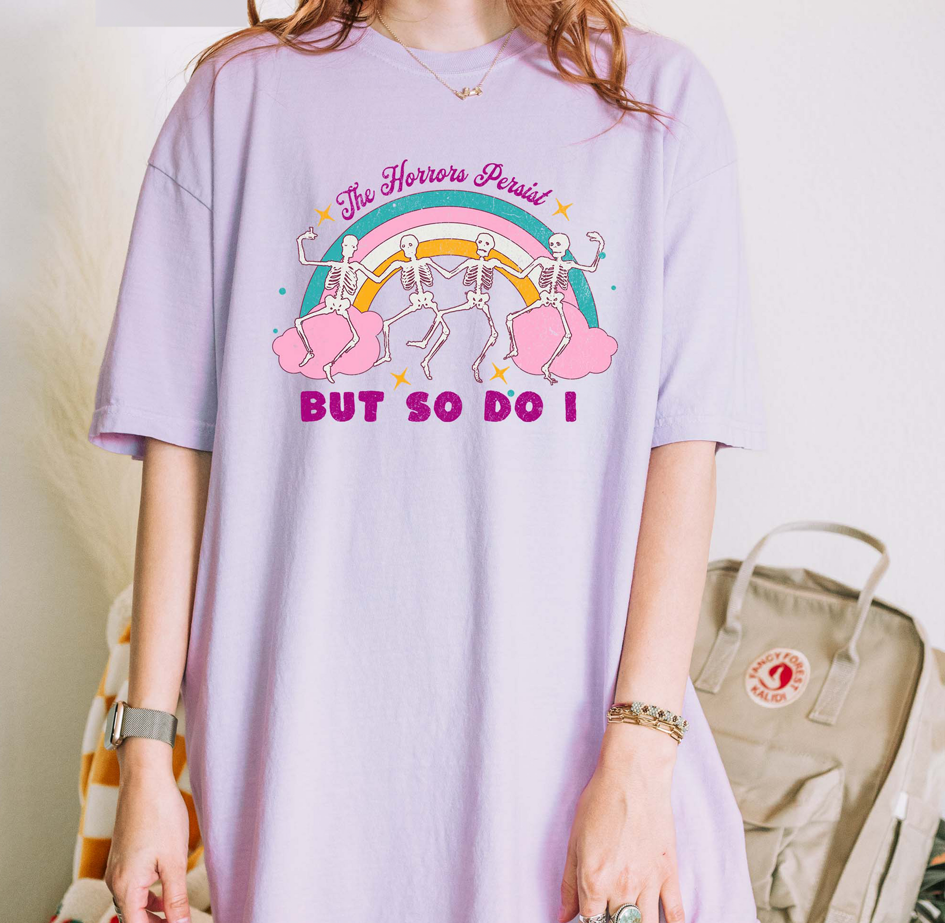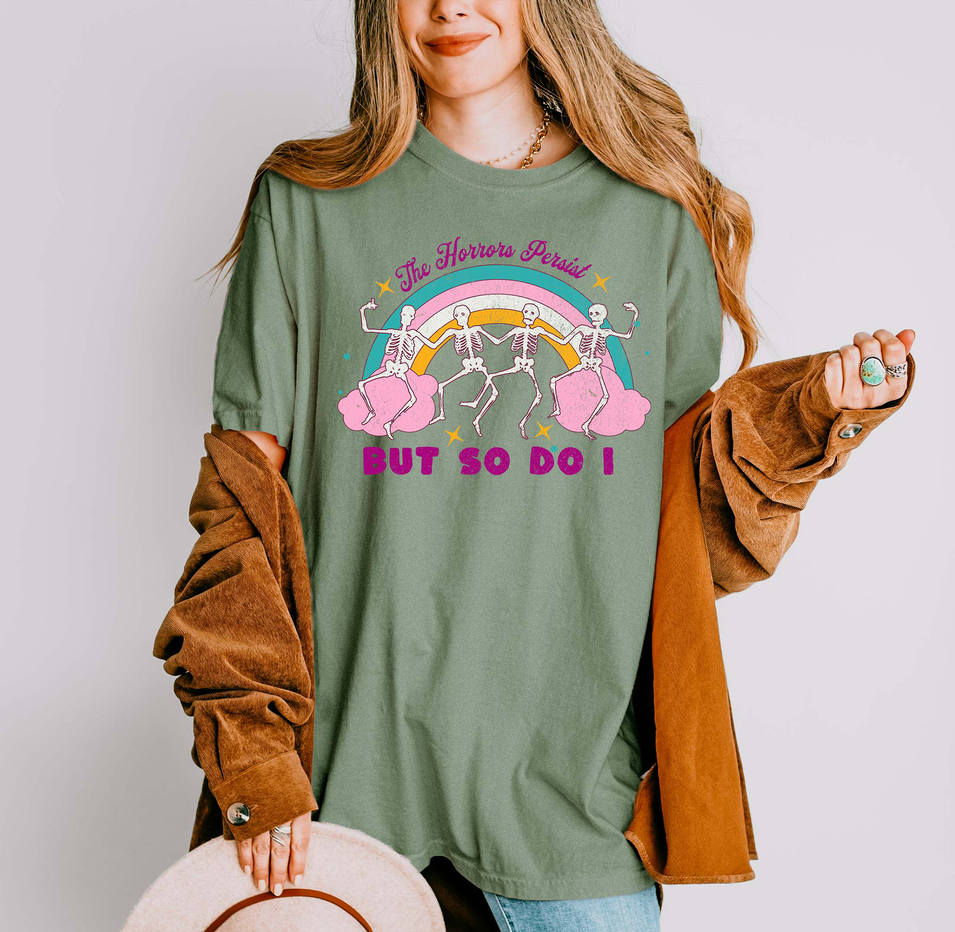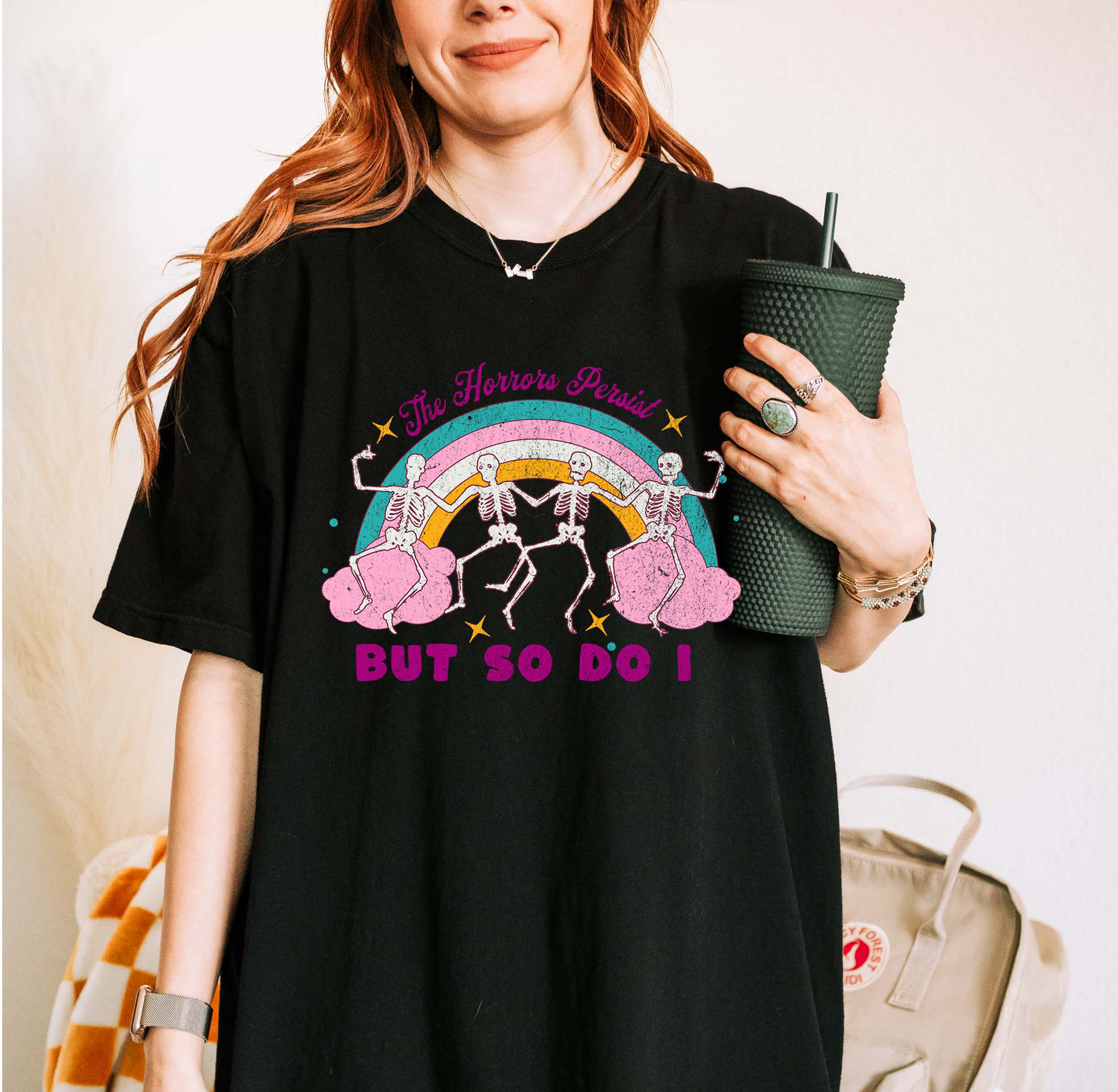 Embrace life and its horrors with the "The Horrors Persist But So Do I" t-shirt! Featuring dancing skeletons beneath a colorful rainbow, this design mixes spooky vibes with a humorous and resilient message. Perfect for Halloween or any time of year when you need a reminder of your inner strength and ability to persist through tough times.