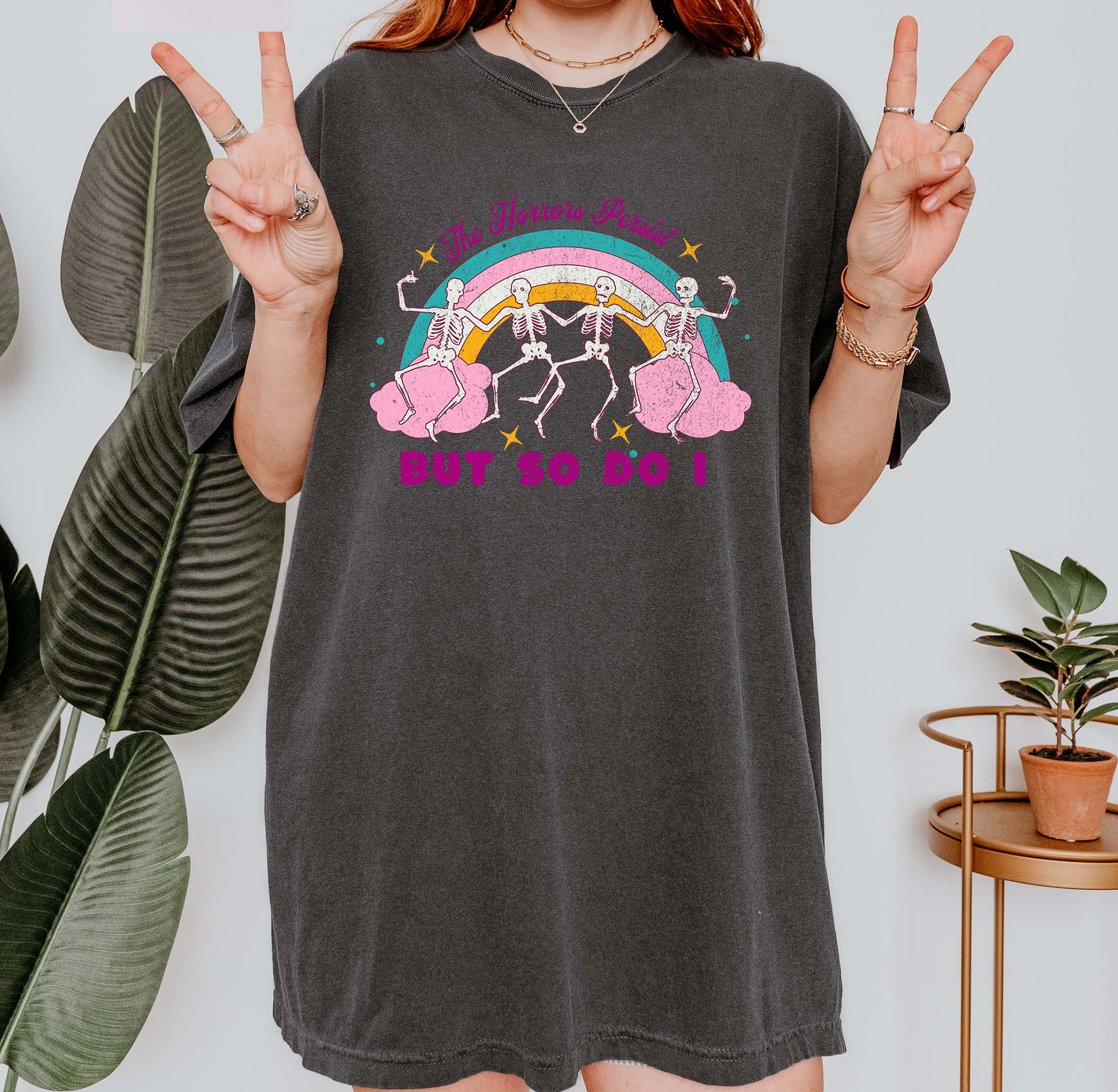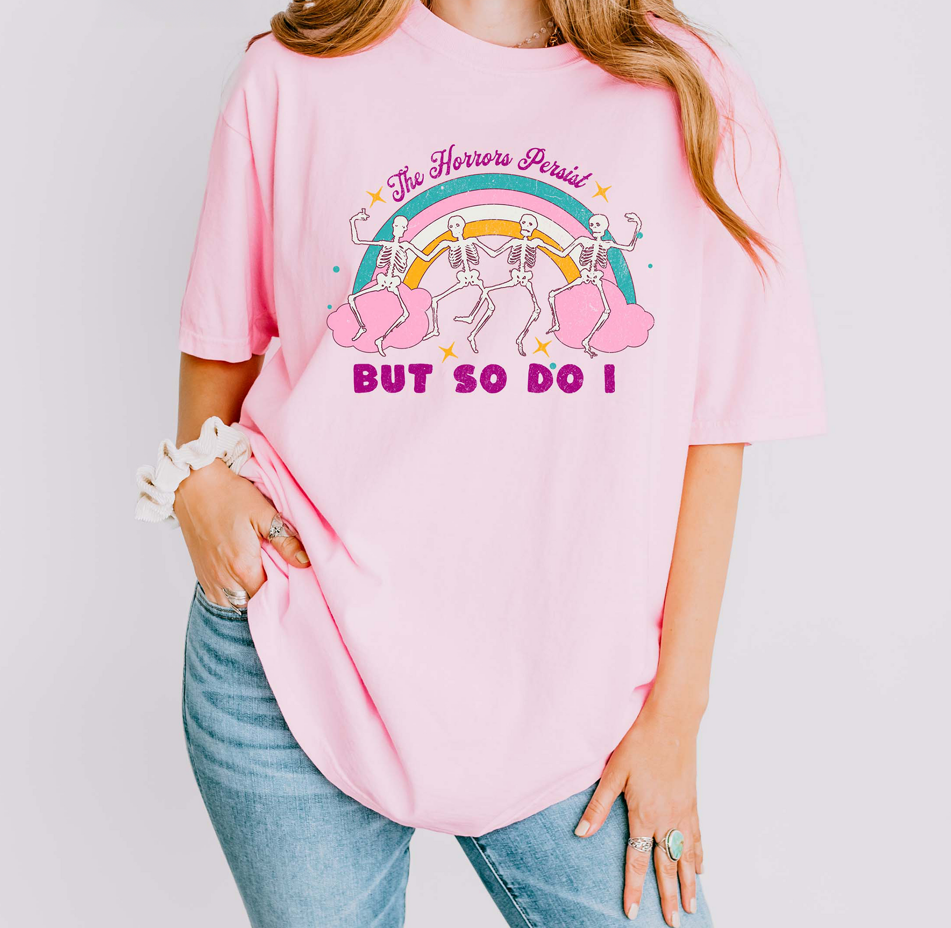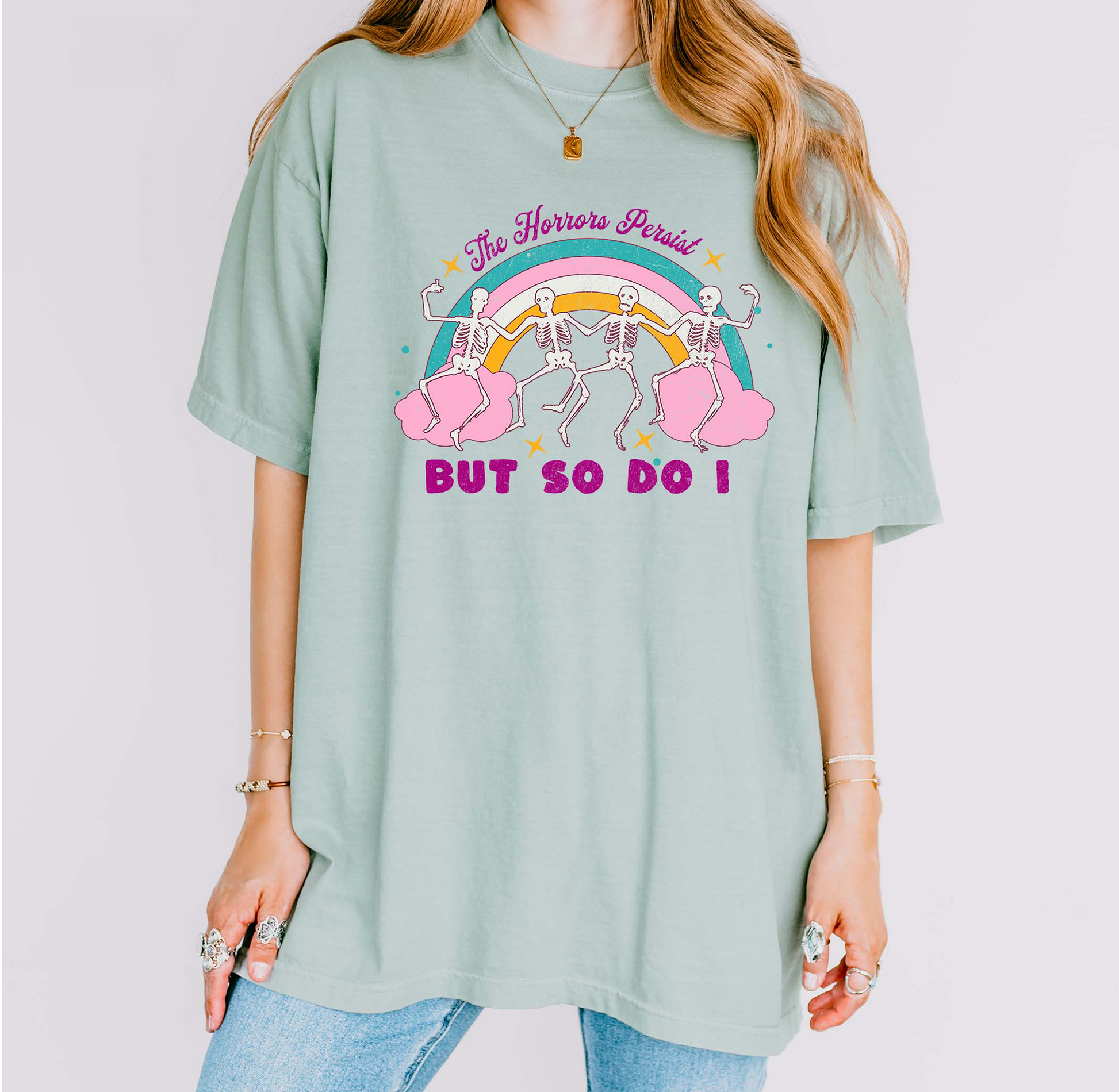 Embrace life and its horrors with the "The Horrors Persist But So Do I" t-shirt! Featuring dancing skeletons beneath a colorful rainbow, this design mixes spooky vibes with a humorous and resilient message. Perfect for Halloween or any time of year when you need a reminder of your inner strength and ability to persist through tough times.