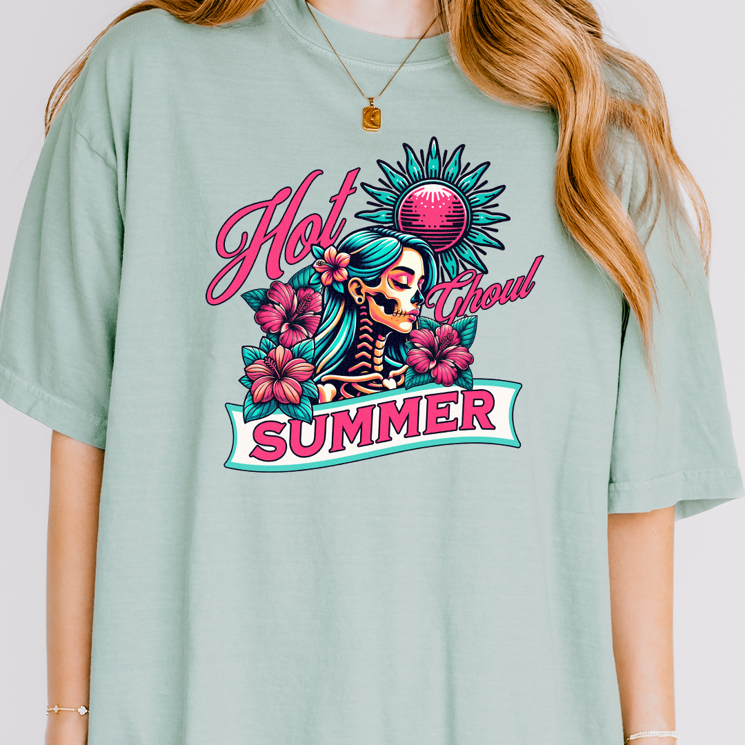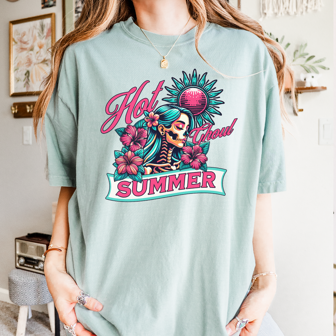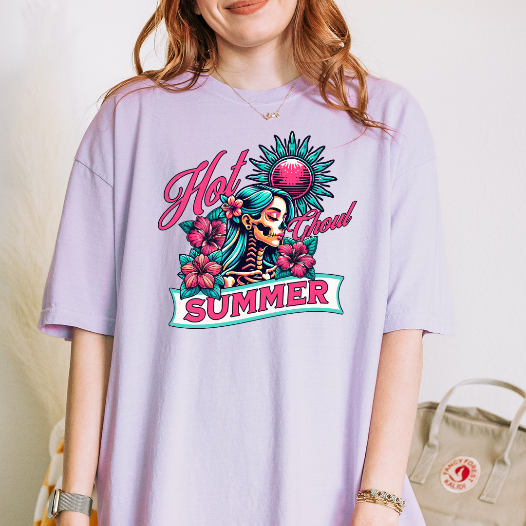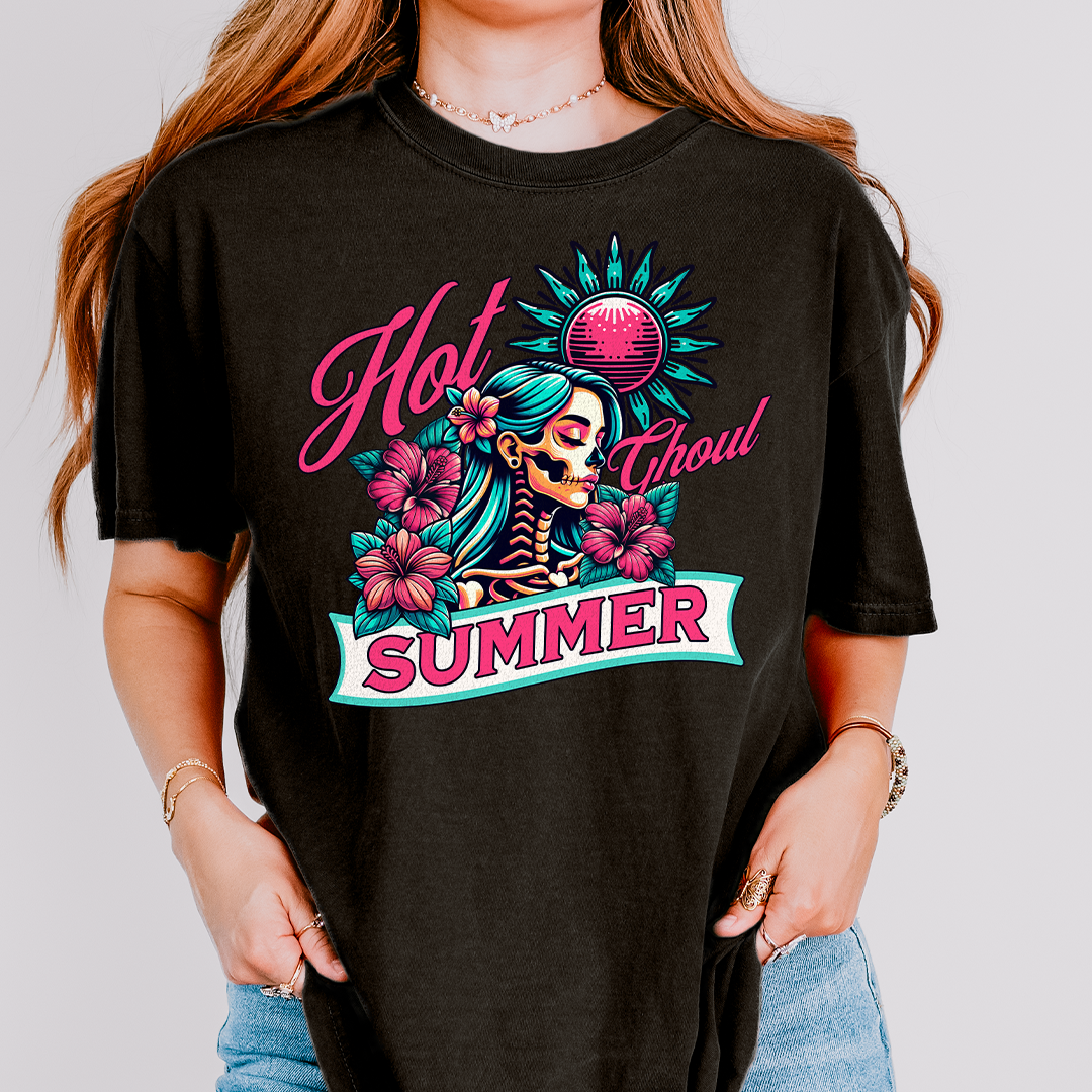 Celebrate your spooky side even under the summer sun with this bold and vibrant "Hot Ghoul Summer" tee. Featuring a sultry skeleton girl framed by tropical florals and a blazing sun, this design blends gothic charm with tropical vibes—perfect for ghouls who thrive in heat and Halloween.