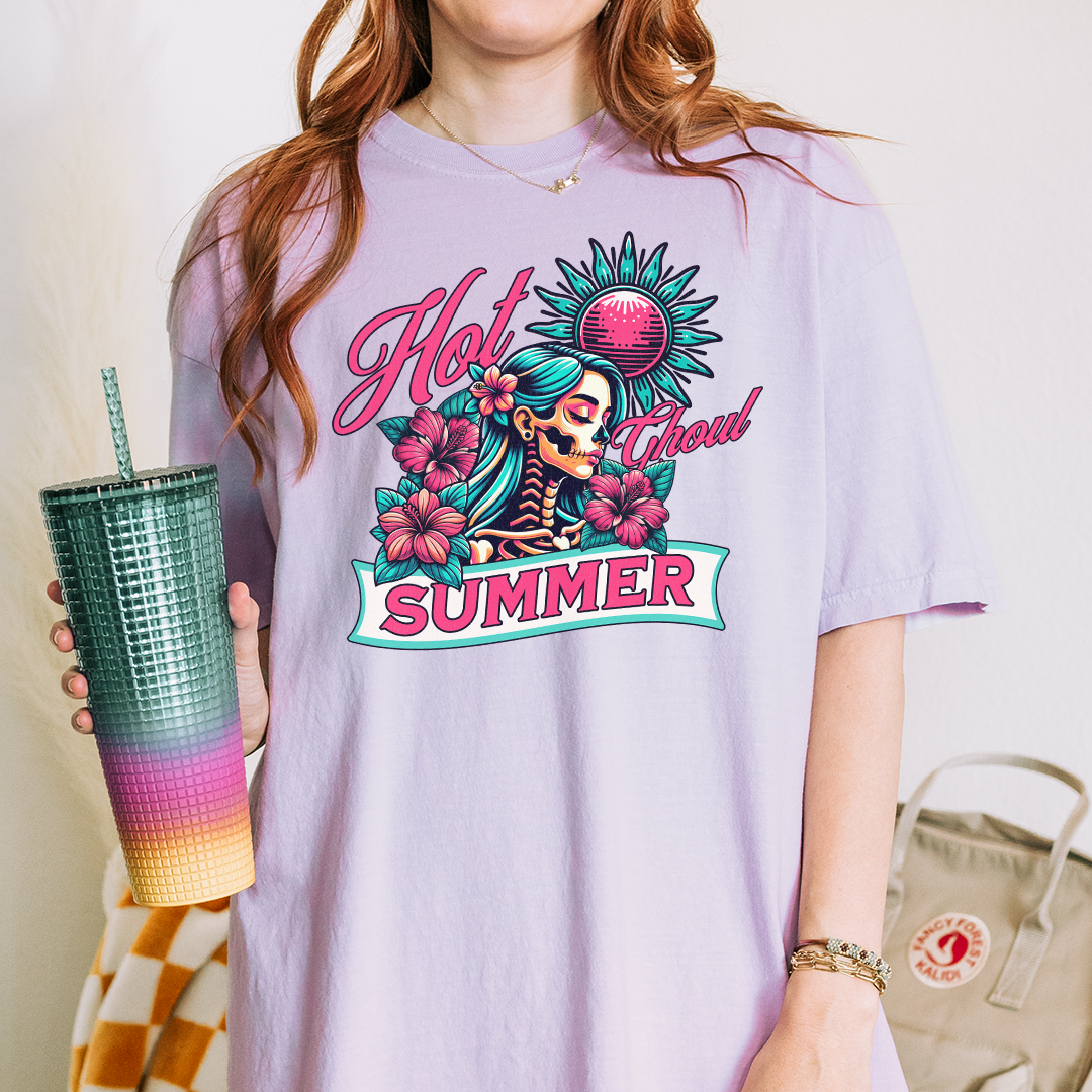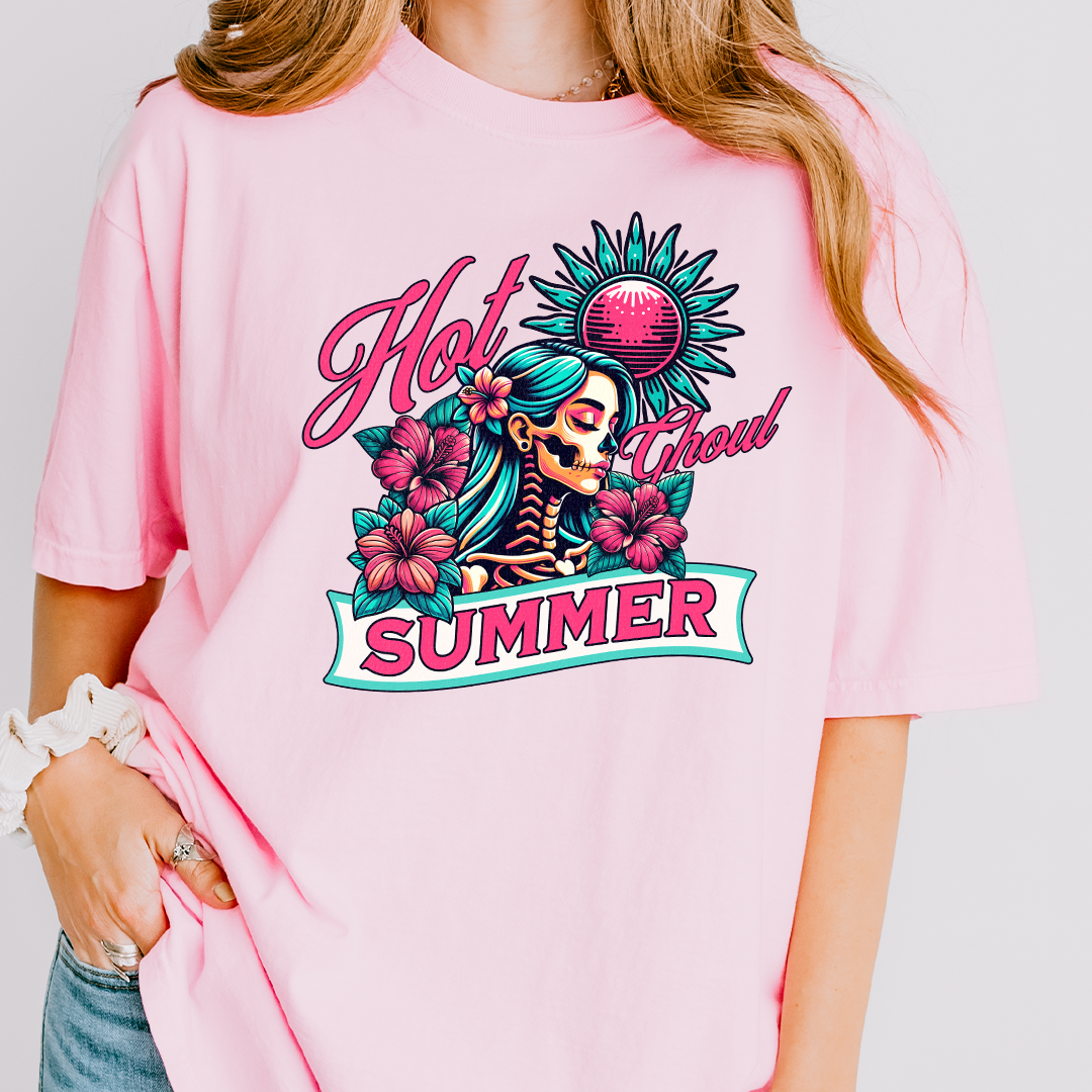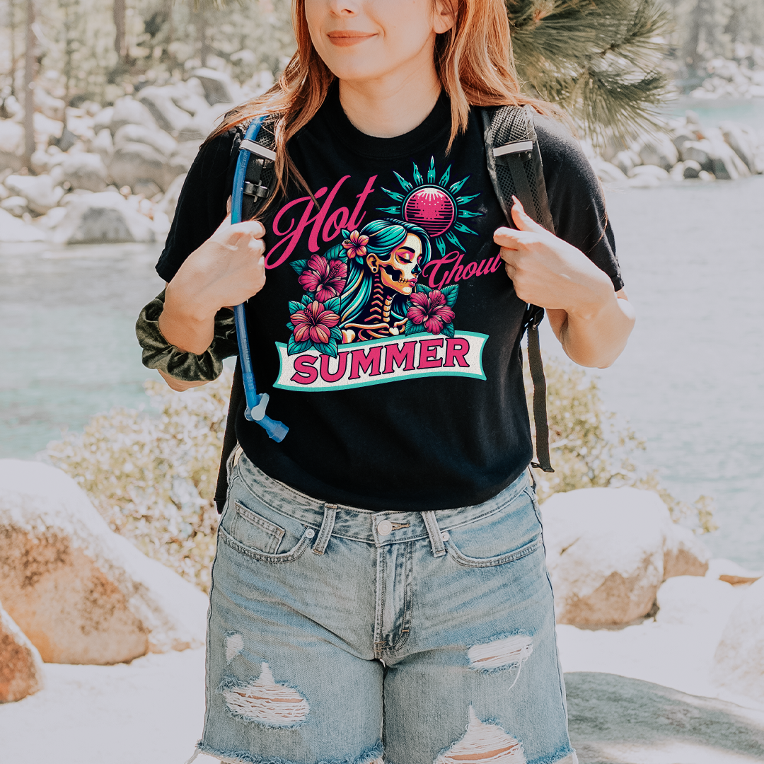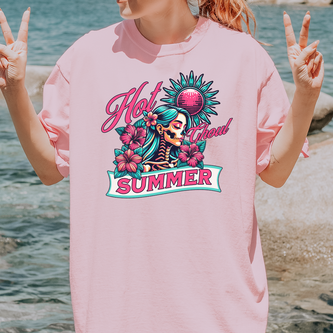 Celebrate your spooky side even under the summer sun with this bold and vibrant "Hot Ghoul Summer" tee. Featuring a sultry skeleton girl framed by tropical florals and a blazing sun, this design blends gothic charm with tropical vibes—perfect for ghouls who thrive in heat and Halloween.