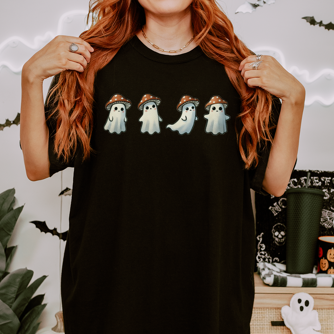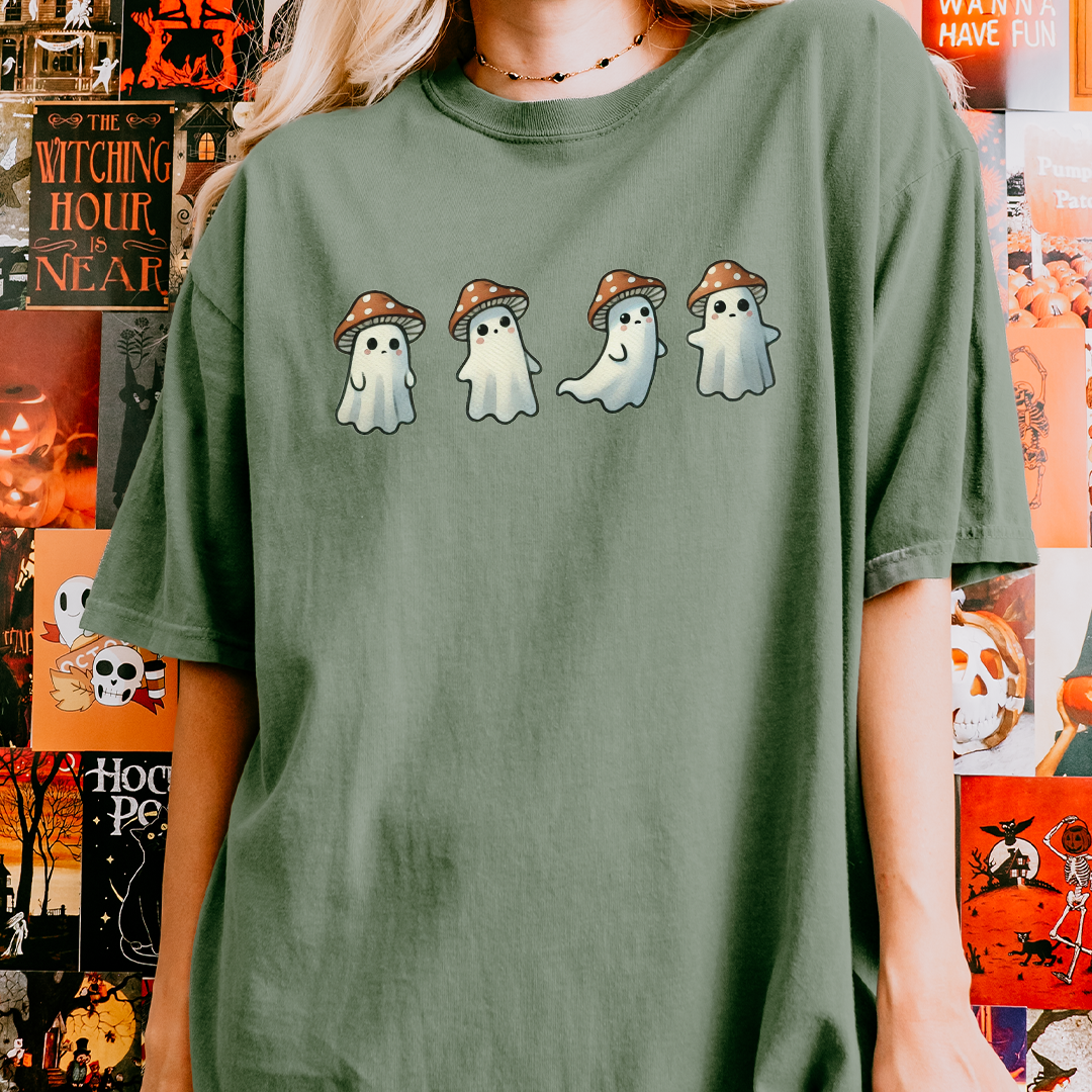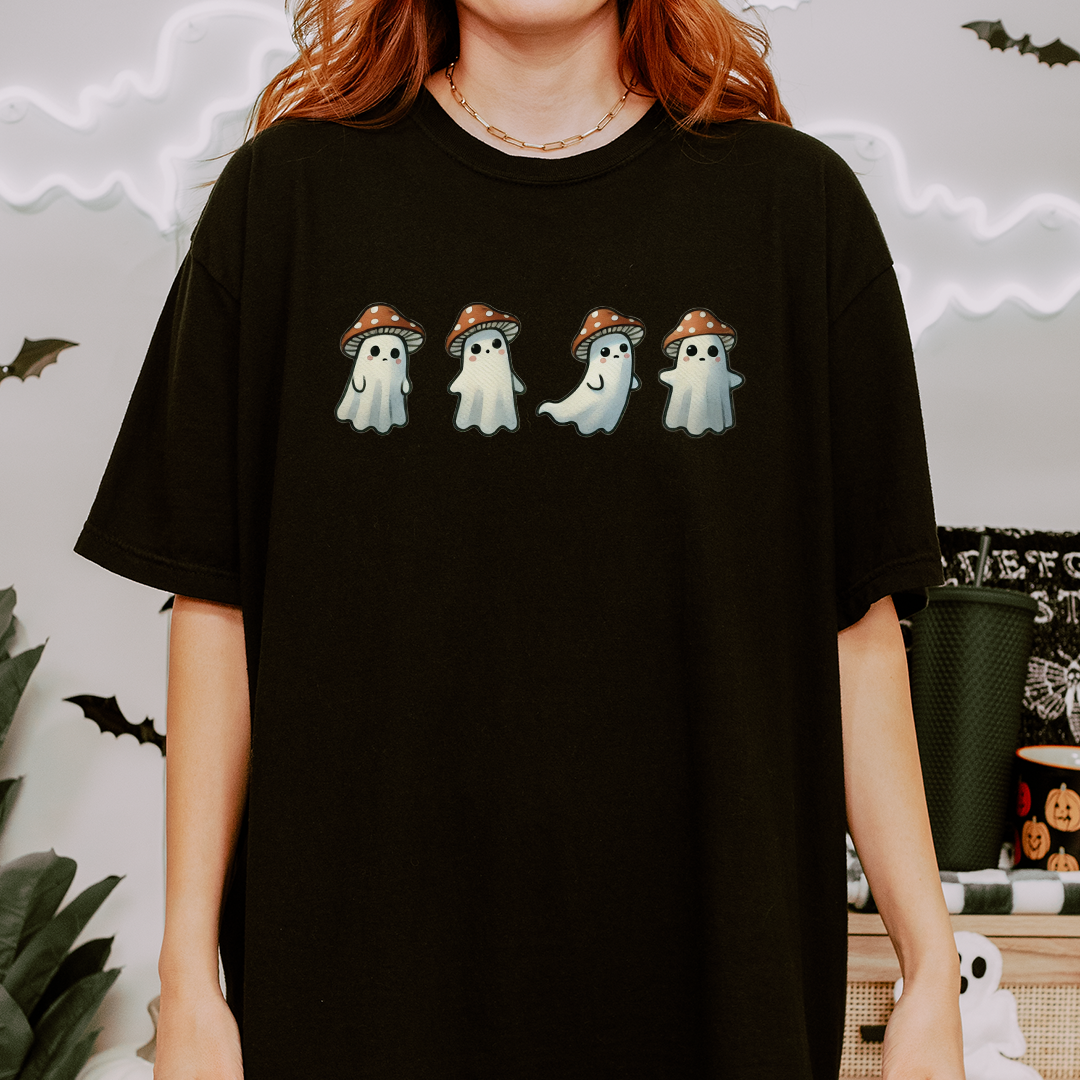 Add a touch of whimsy to your wardrobe with this adorable Mushroom Ghost t-shirt! Featuring four cute little ghosts wearing mushroom caps, this cozy, oversized tee is perfect for the Halloween season and beyond. The playful design combines the magic of cottagecore with spooky-cute vibes, making it an ideal choice for those who love unique and charming styles.