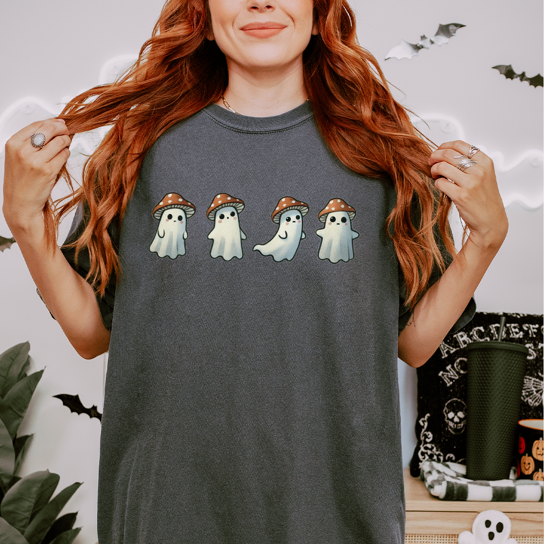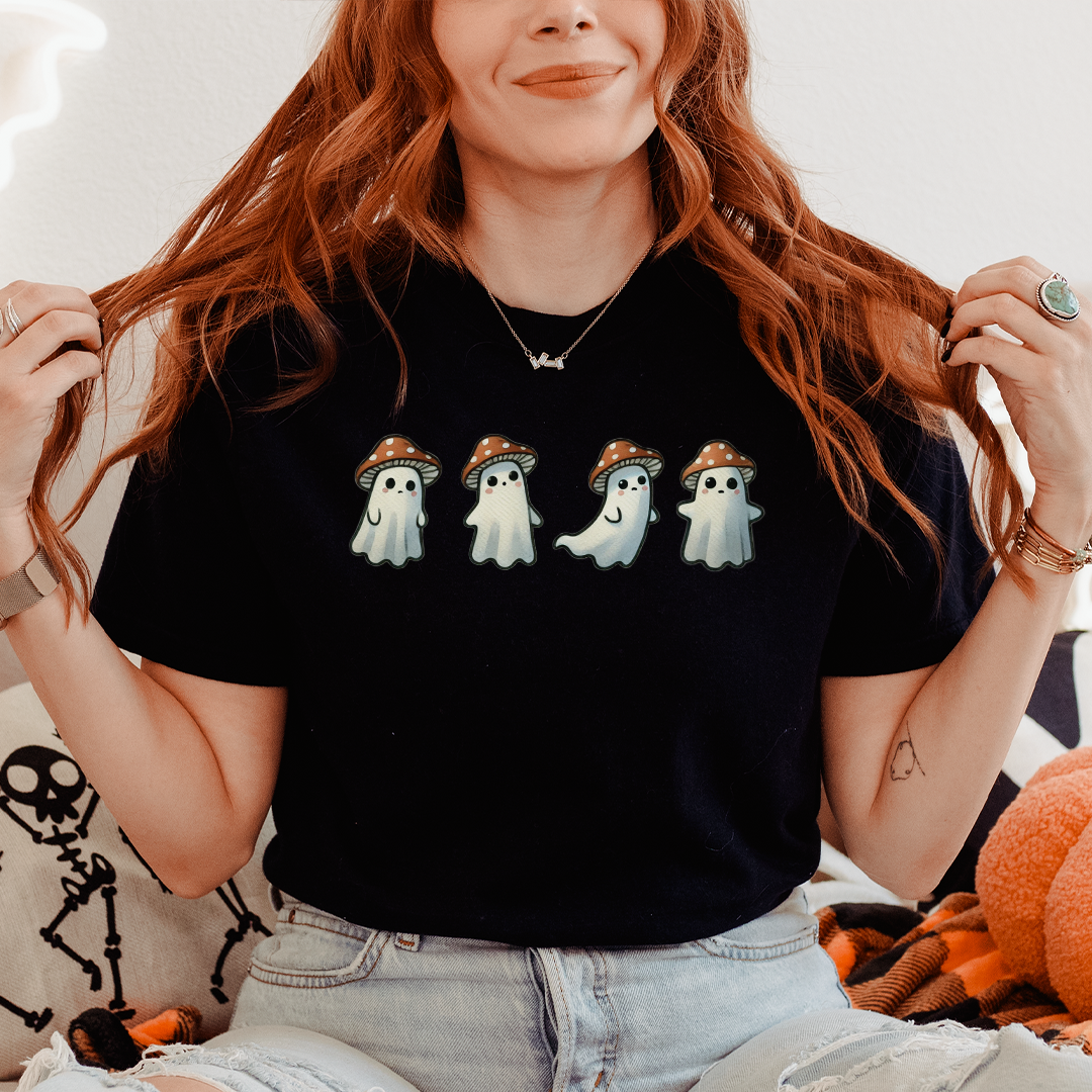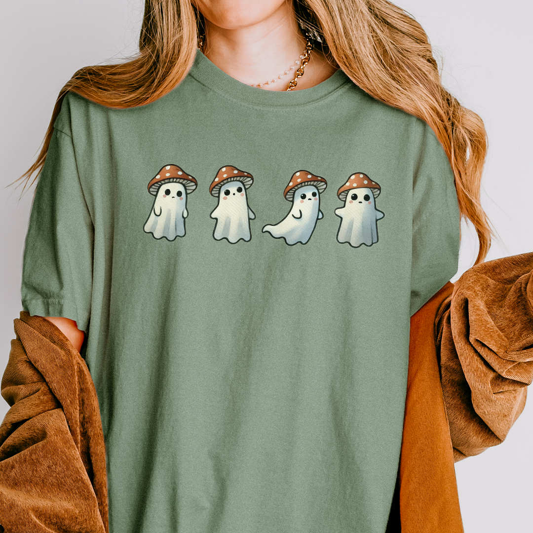 Add a touch of whimsy to your wardrobe with this adorable Mushroom Ghost t-shirt! Featuring four cute little ghosts wearing mushroom caps, this cozy, oversized tee is perfect for the Halloween season and beyond. The playful design combines the magic of cottagecore with spooky-cute vibes, making it an ideal choice for those who love unique and charming styles.
