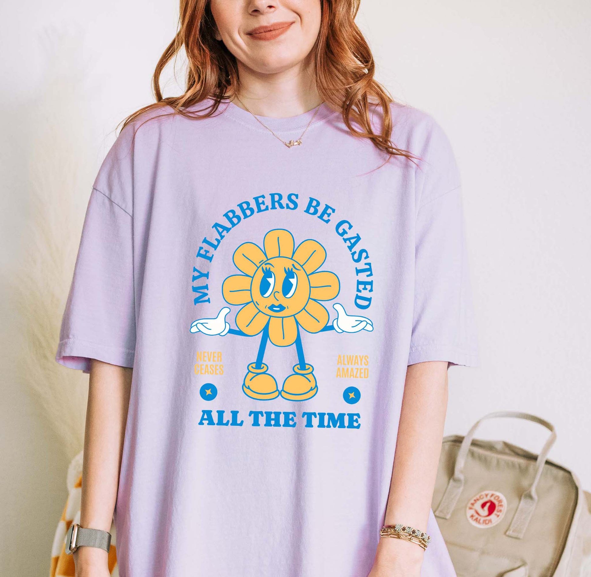 Introducing our "Flabbers Be Gasted" T-Shirt - the perfect blend of witty humor and vintage charm! This eye-catching tee is designed for those who love to turn heads and break the mold. In a fetching cornflower blue and muted yellow color palette, this tee features the hilarious mantra "Flabbers Be Gasted" in retro-inspired font, guaranteed to spark conversations and spread smiles wherever you go. And the fun doesn't stop there - a whimsical vintage yellow flower mascot takes center stage to add an extra touch of character to this quirky design.