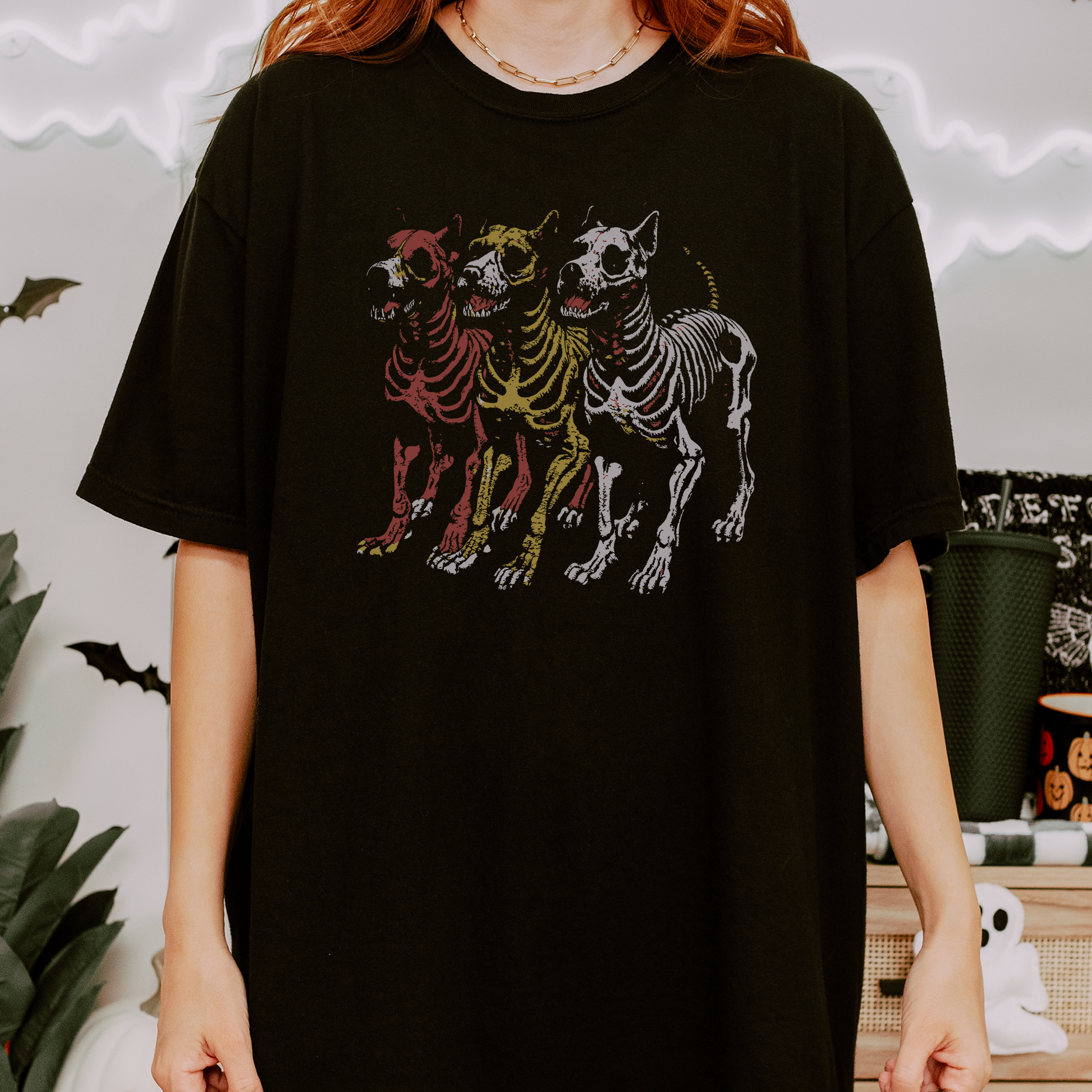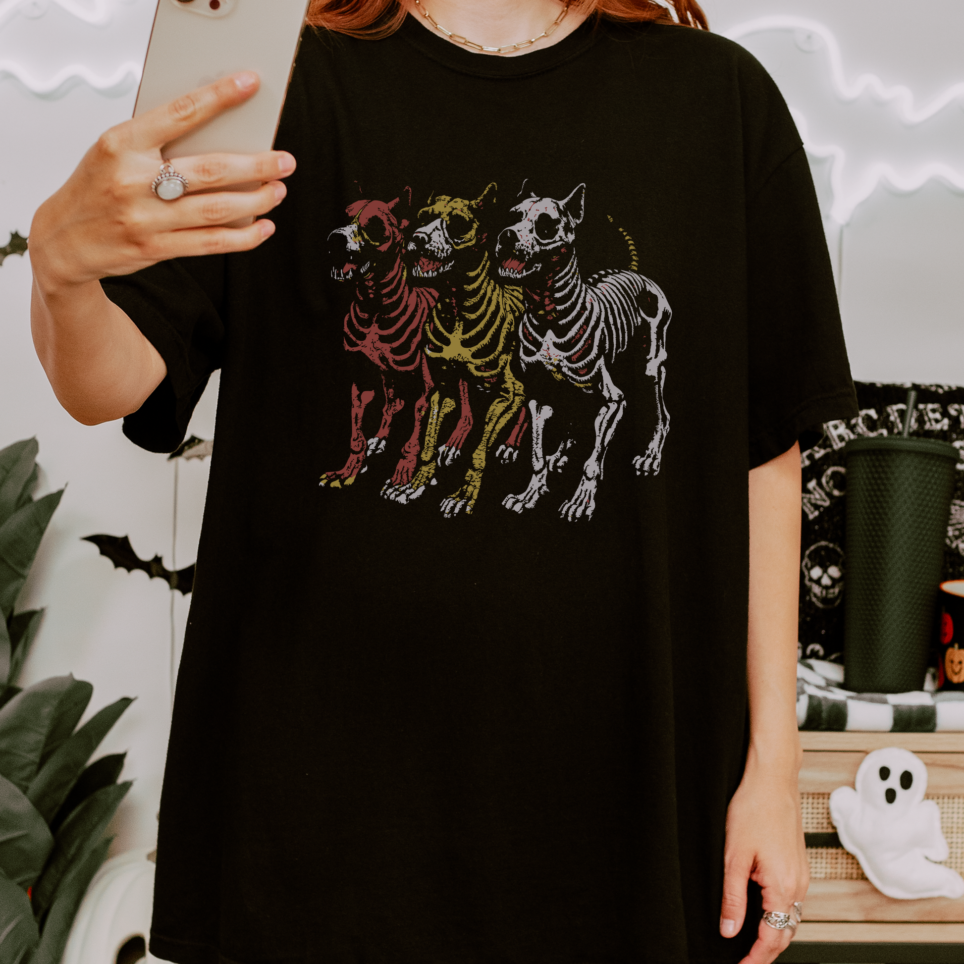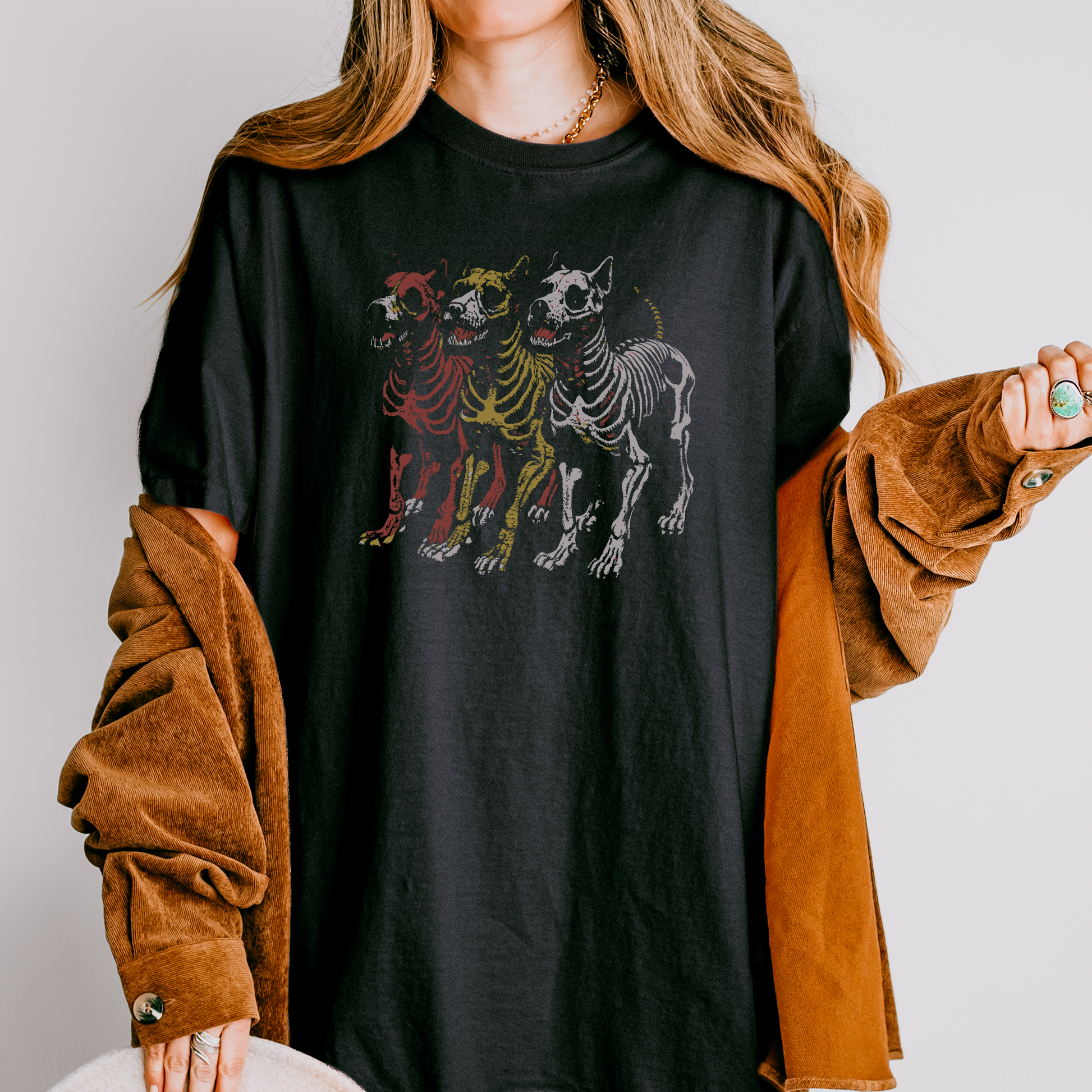 Unleash the ultimate spooky vibes with this Zombie Skeleton Dogs T-Shirt. Featuring three eerie skeletal hounds in haunting red, yellow, and white tones, this tee is the perfect mix of creepy, gothic, and badass. Whether you’re channeling horror-core aesthetics, gearing up for Halloween, or just love standing out with edgy streetwear, this shirt will be your new favorite go-to.
