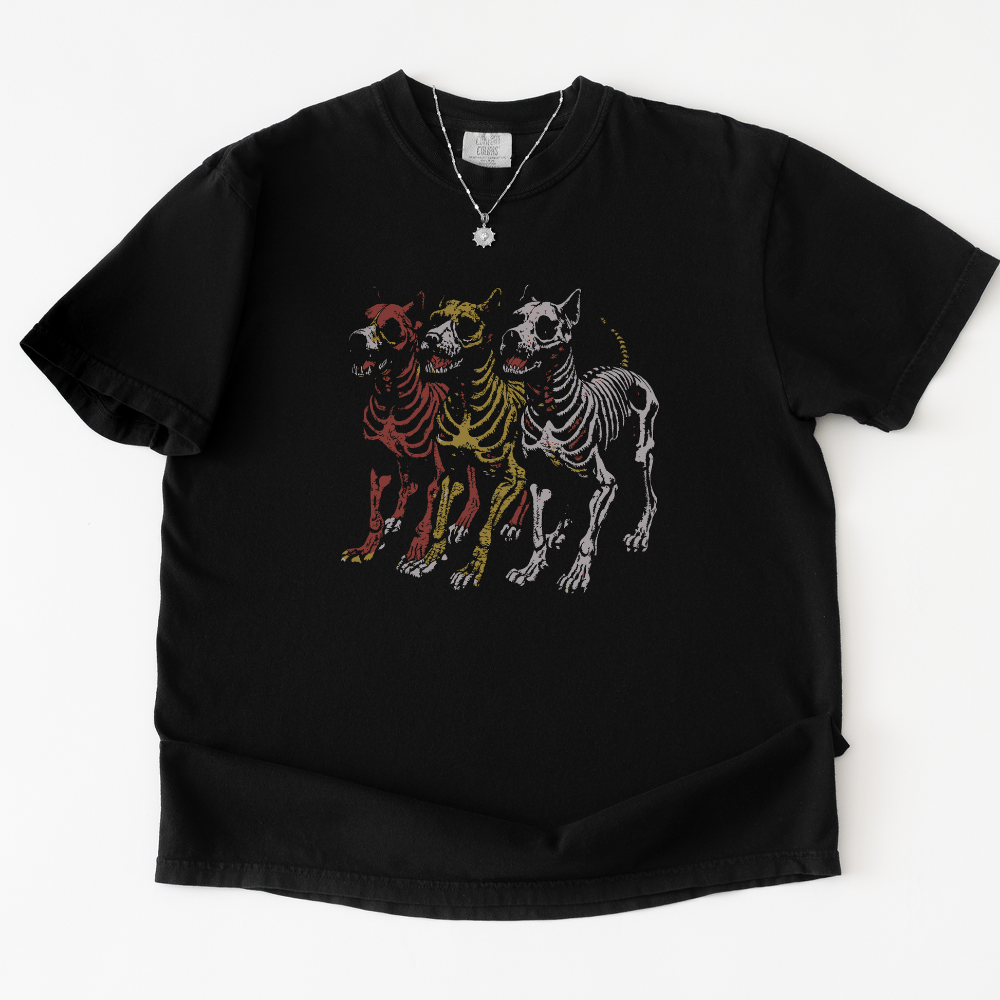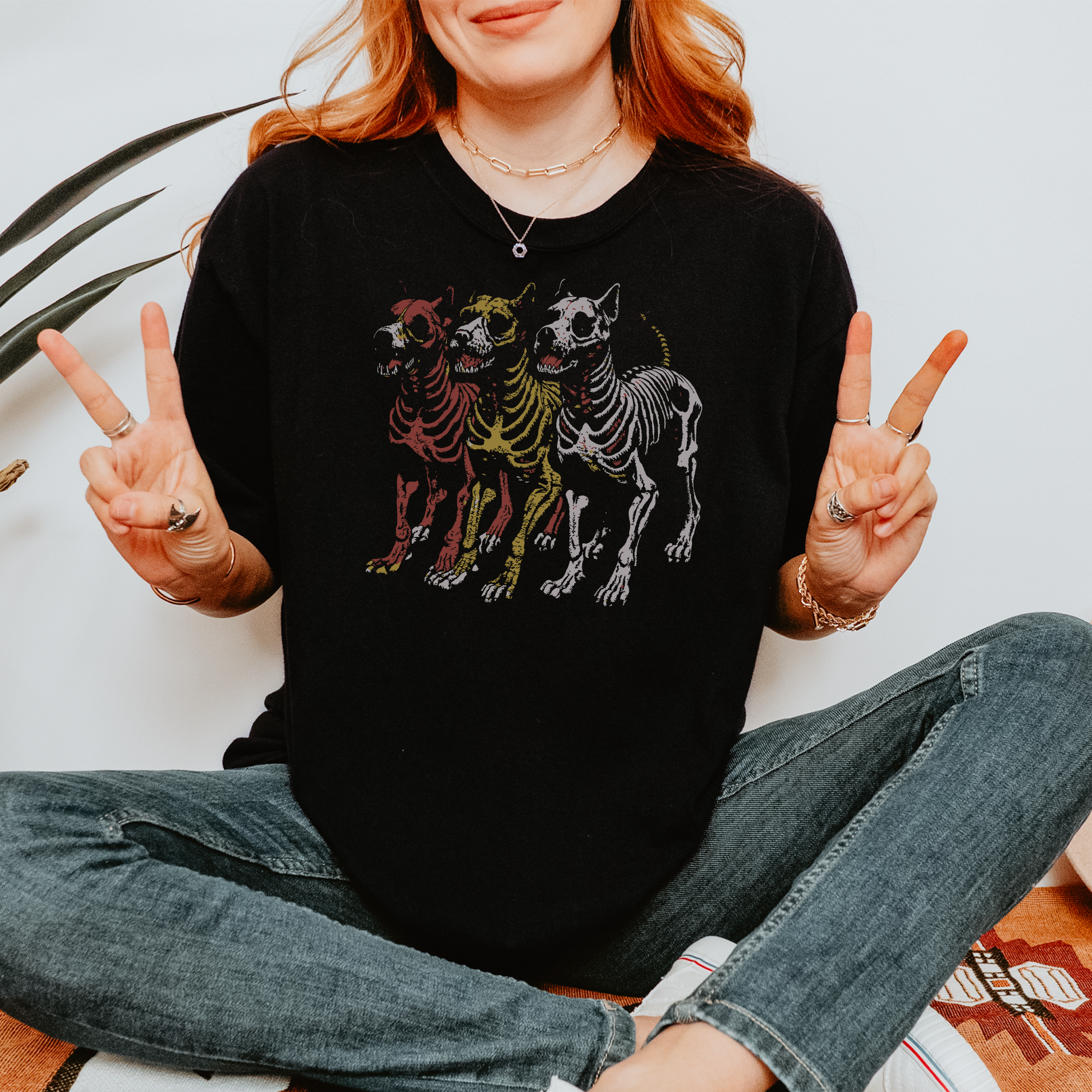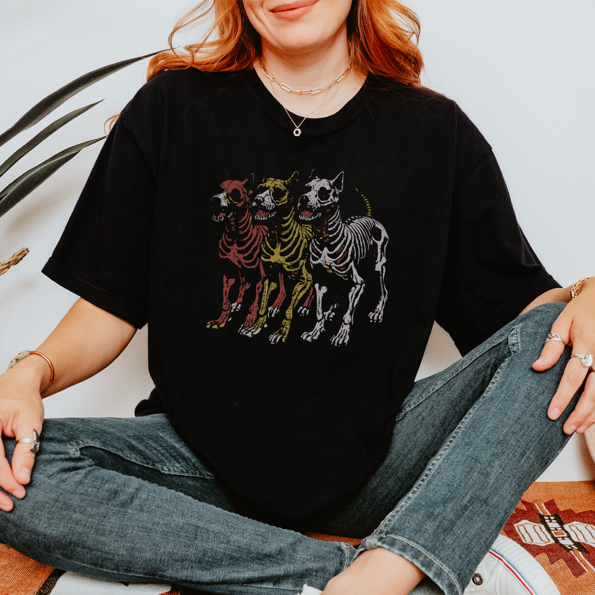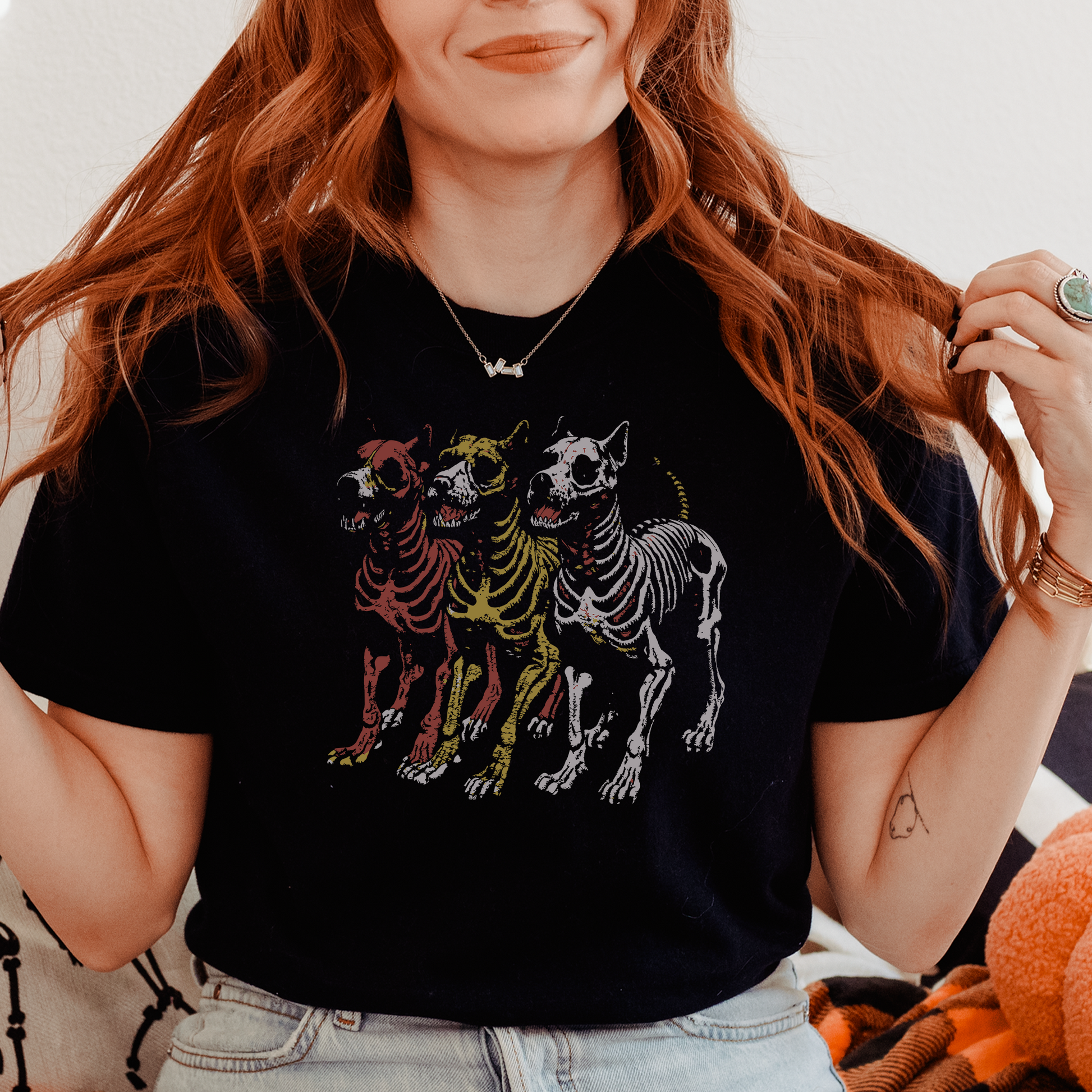 Unleash the ultimate spooky vibes with this Zombie Skeleton Dogs T-Shirt. Featuring three eerie skeletal hounds in haunting red, yellow, and white tones, this tee is the perfect mix of creepy, gothic, and badass. Whether you’re channeling horror-core aesthetics, gearing up for Halloween, or just love standing out with edgy streetwear, this shirt will be your new favorite go-to.