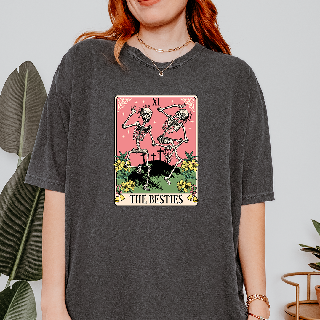 This vintage tarot card-inspired t-shirt features two skeletons dancing gleefully in a graveyard — a tribute to inside jokes, soul bonds, and witchy friendship that transcends time (and death).