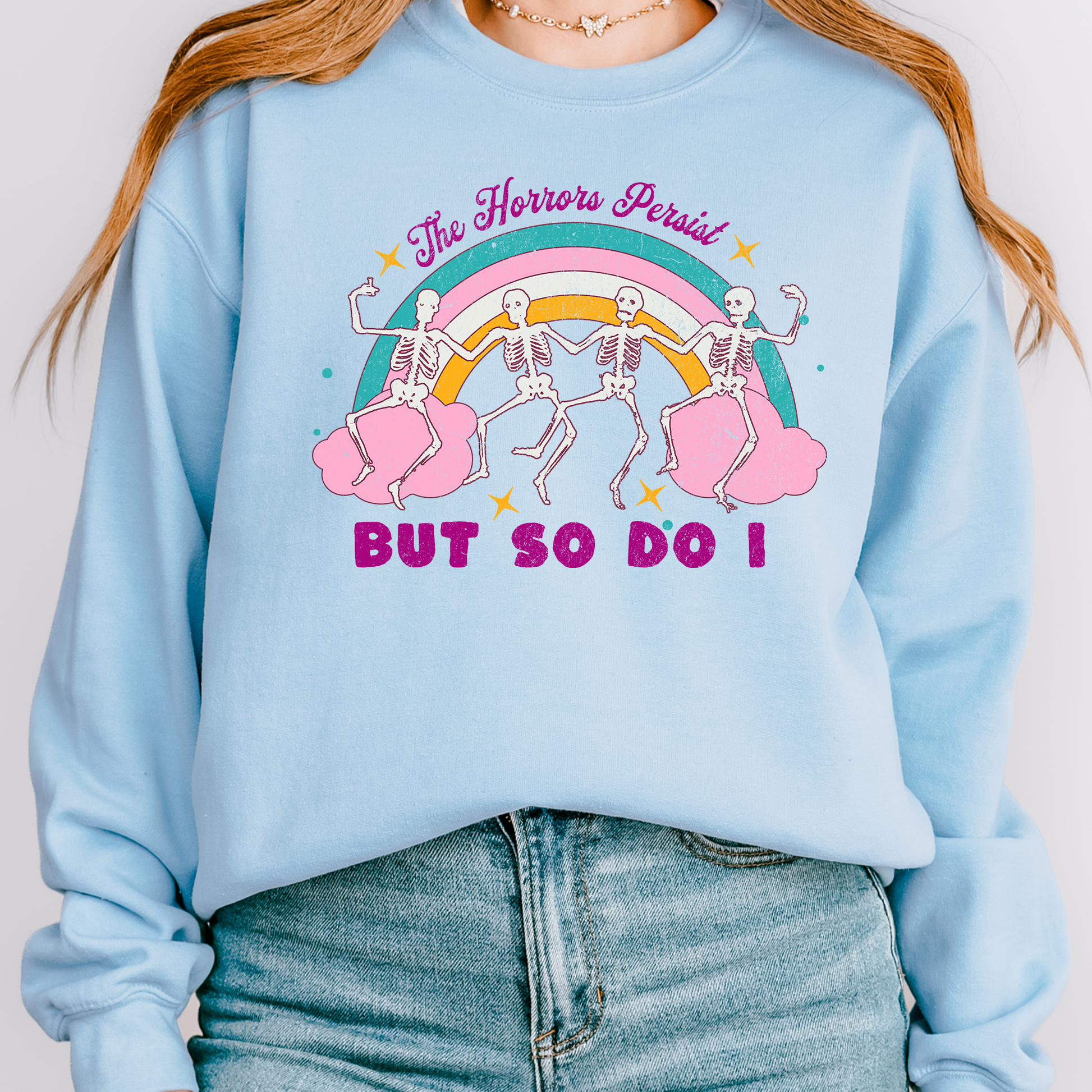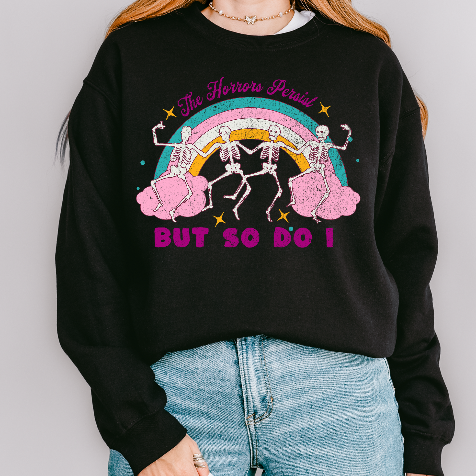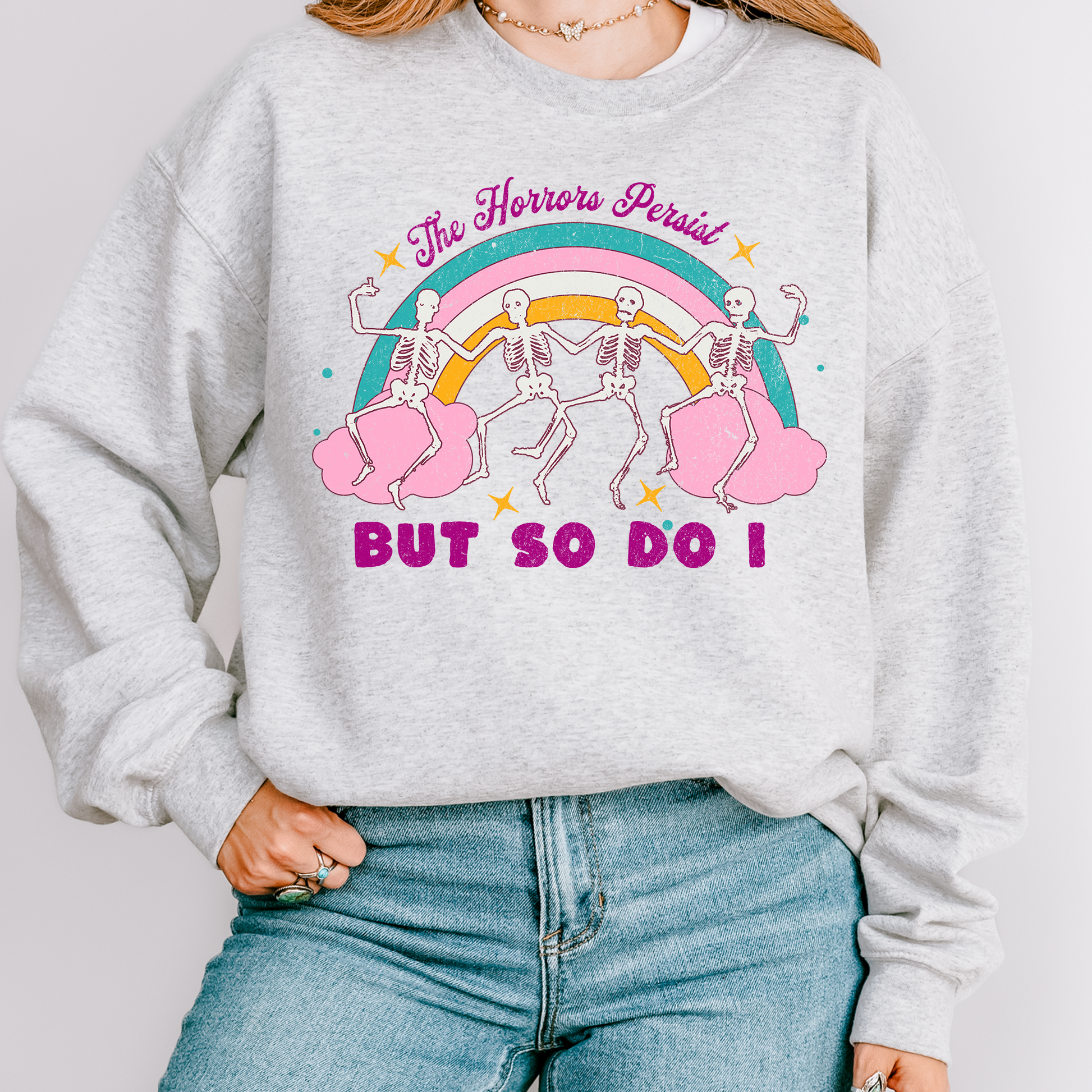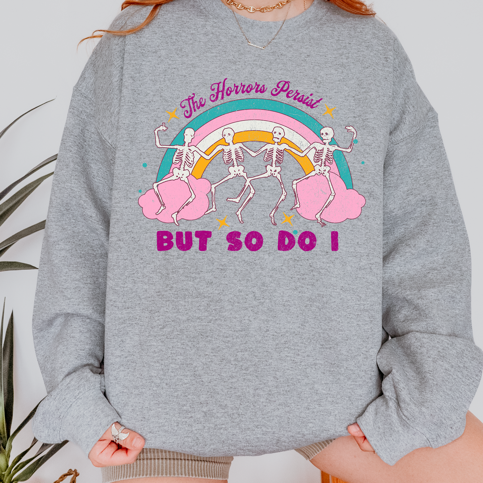 Embrace the spooky season with this playful "The Horrors Persist But So Do I" sweatshirt! Featuring dancing skeletons beneath a colorful rainbow, this design mixes spooky vibes with a humorous and resilient message. Perfect for Halloween or any time of year when you need a reminder of your inner strength and ability to persist through tough times.