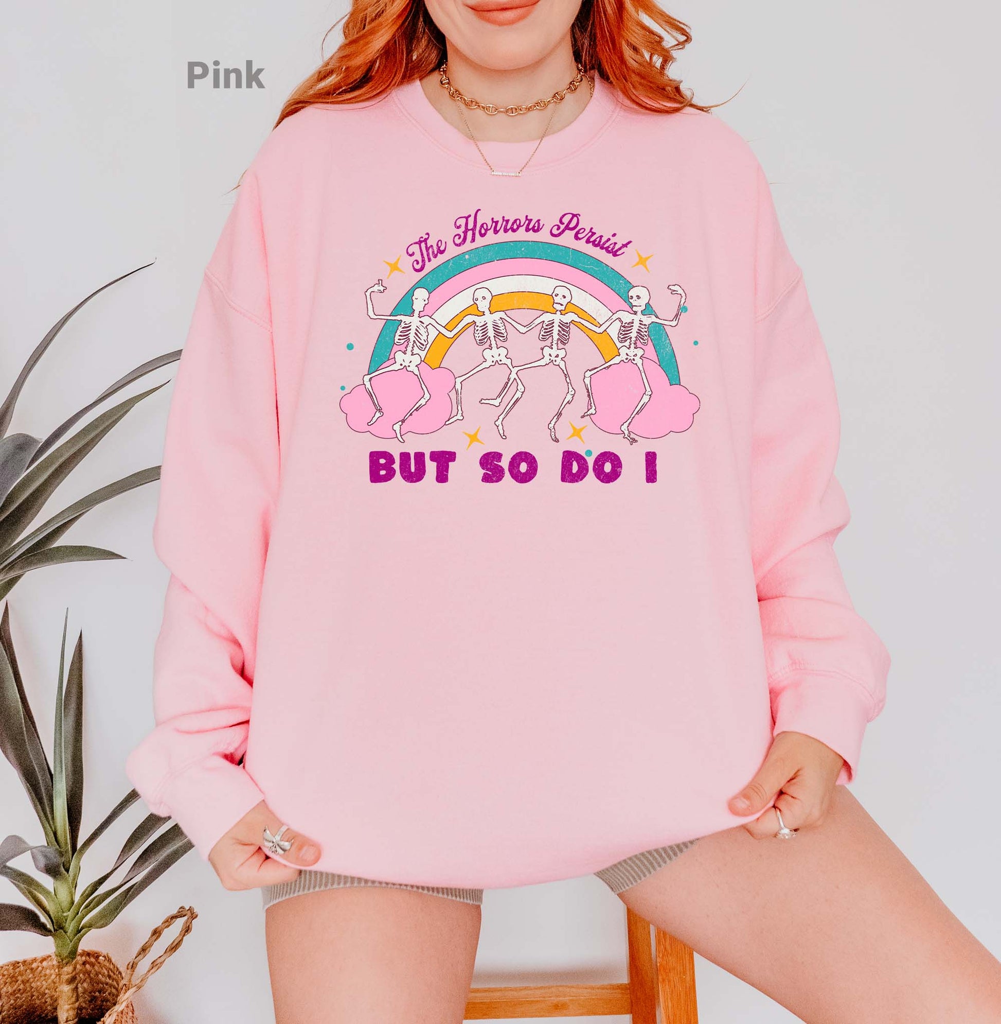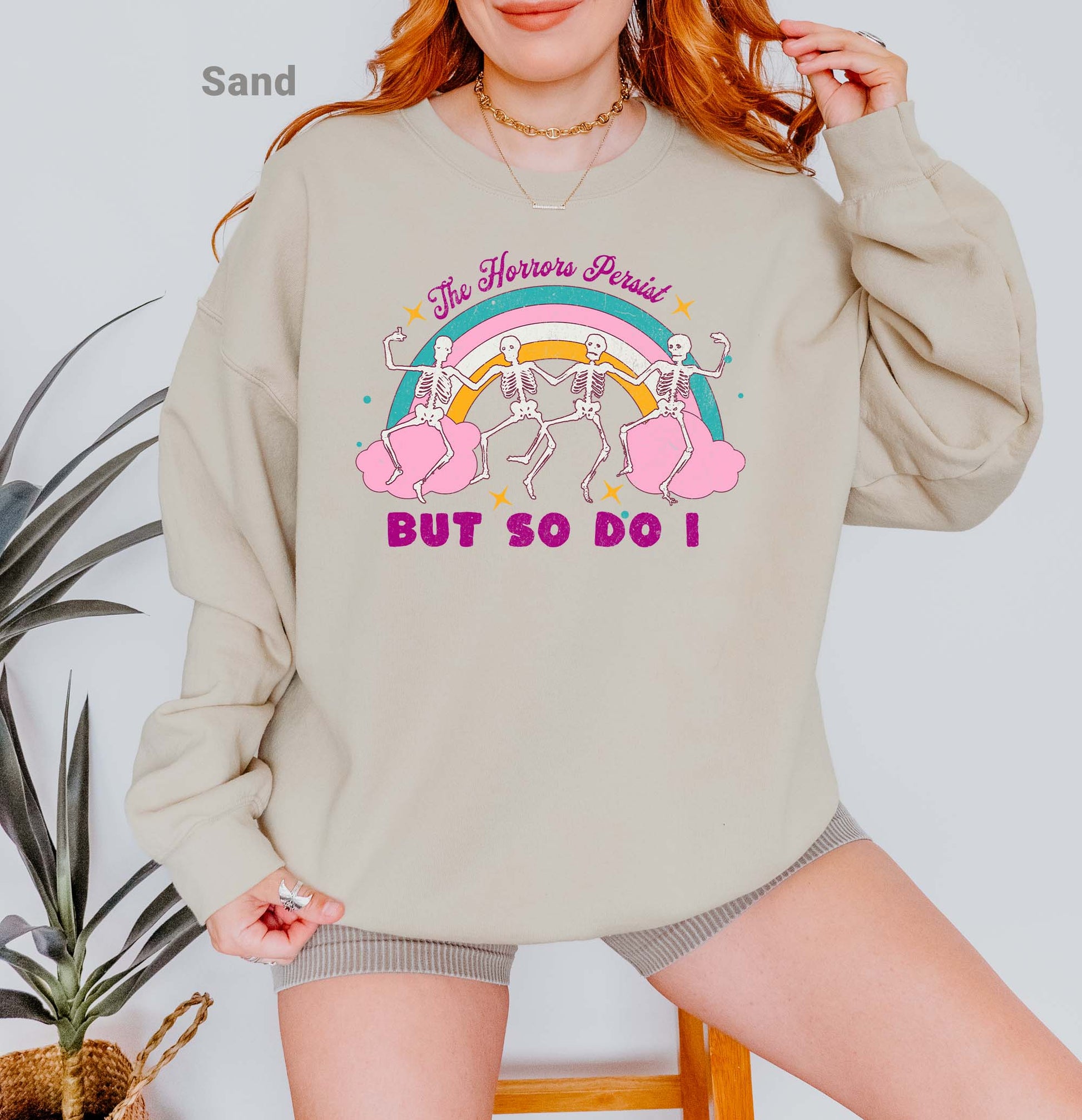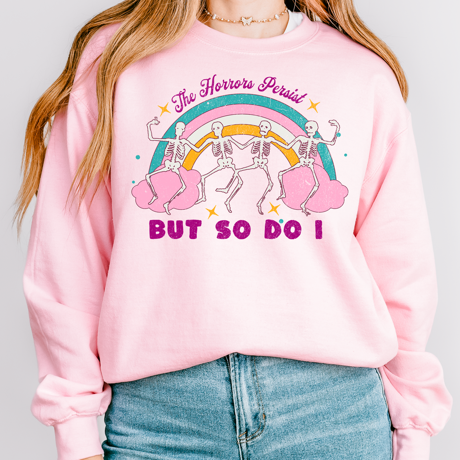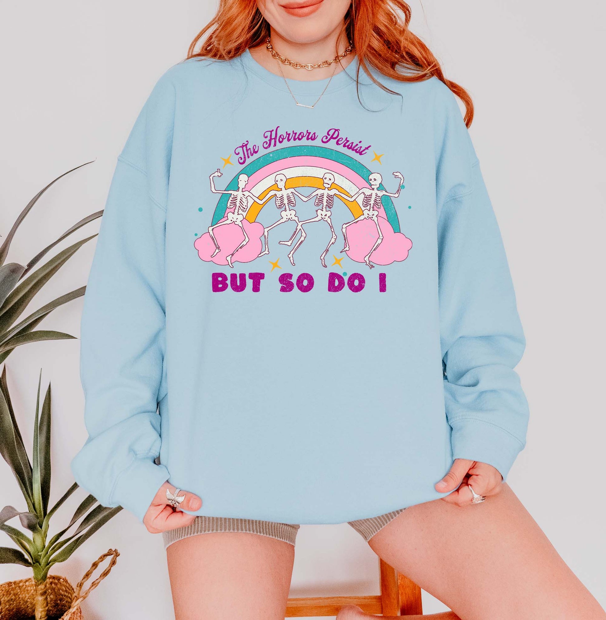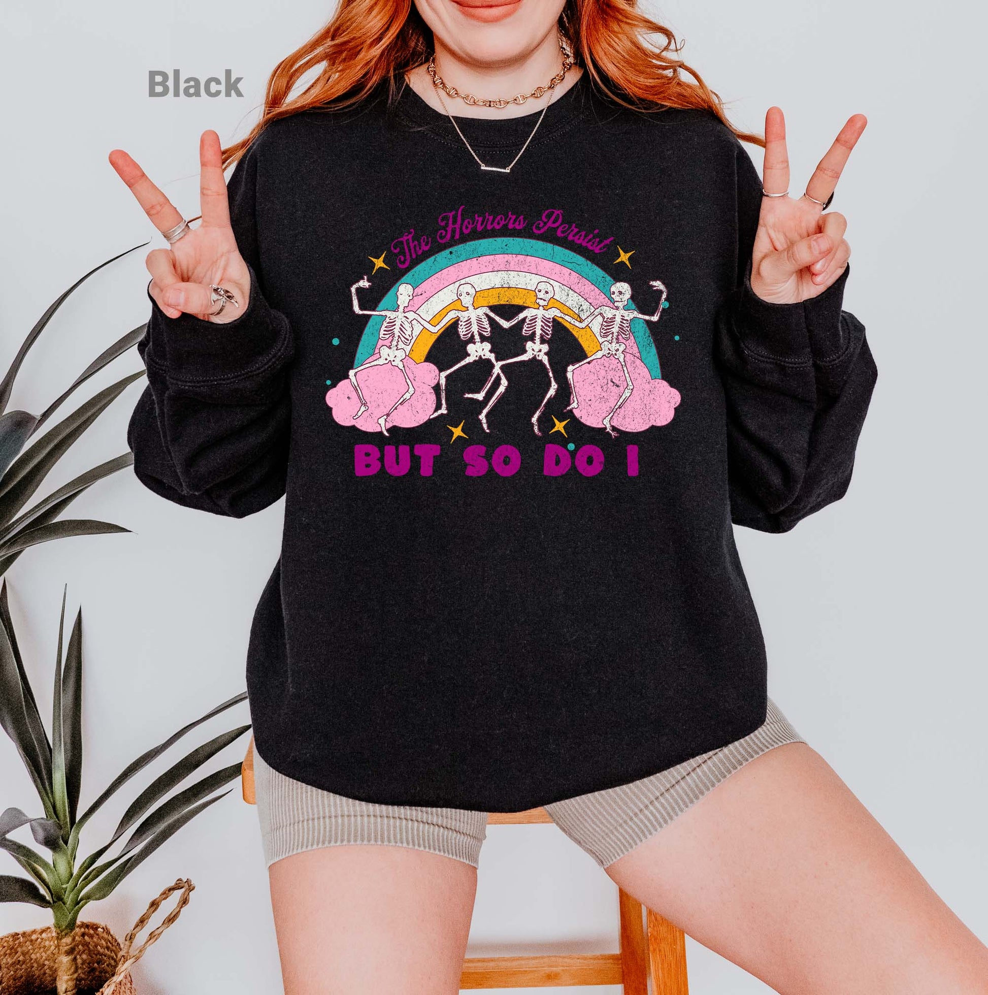 This unique "The horrors persist but so do I" sweatshirt is bound to match your dark humor with a fun and spooky rainbow design!