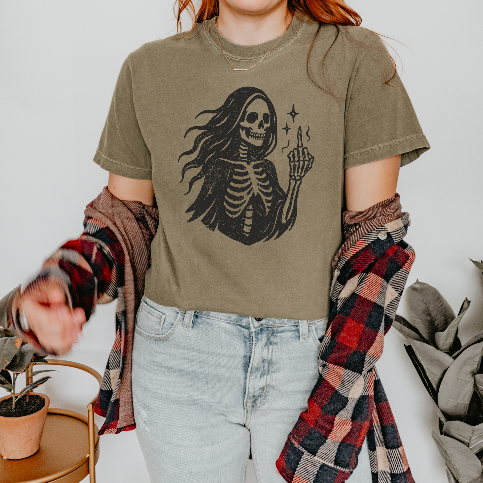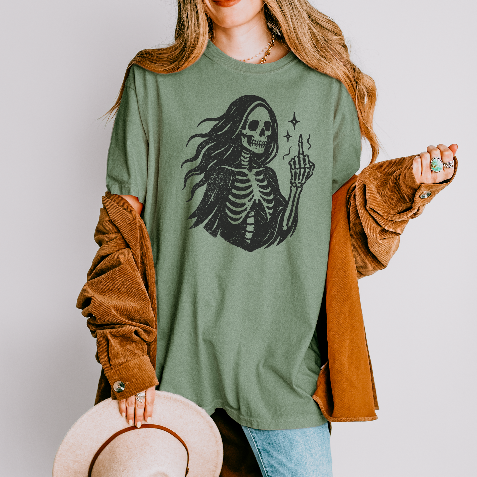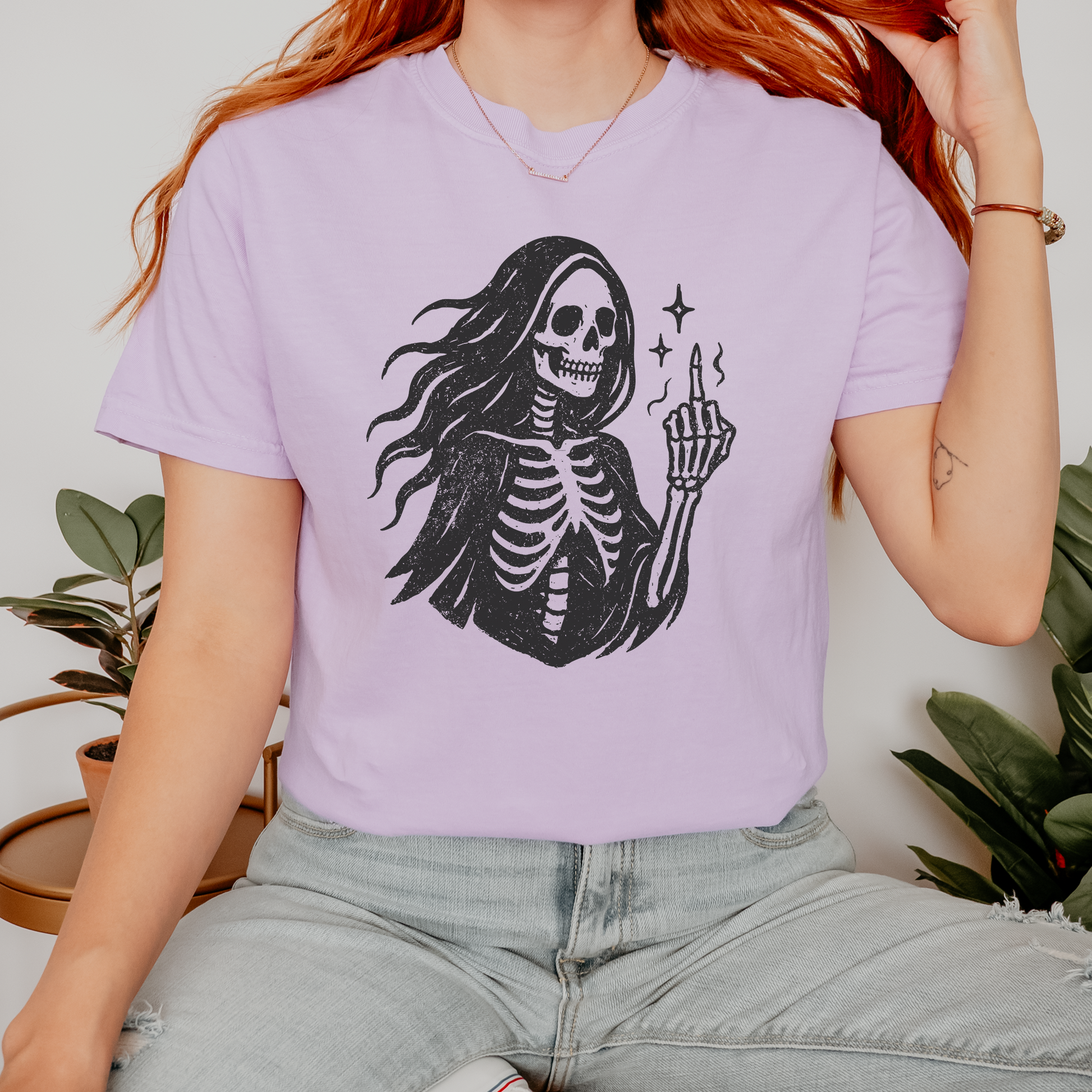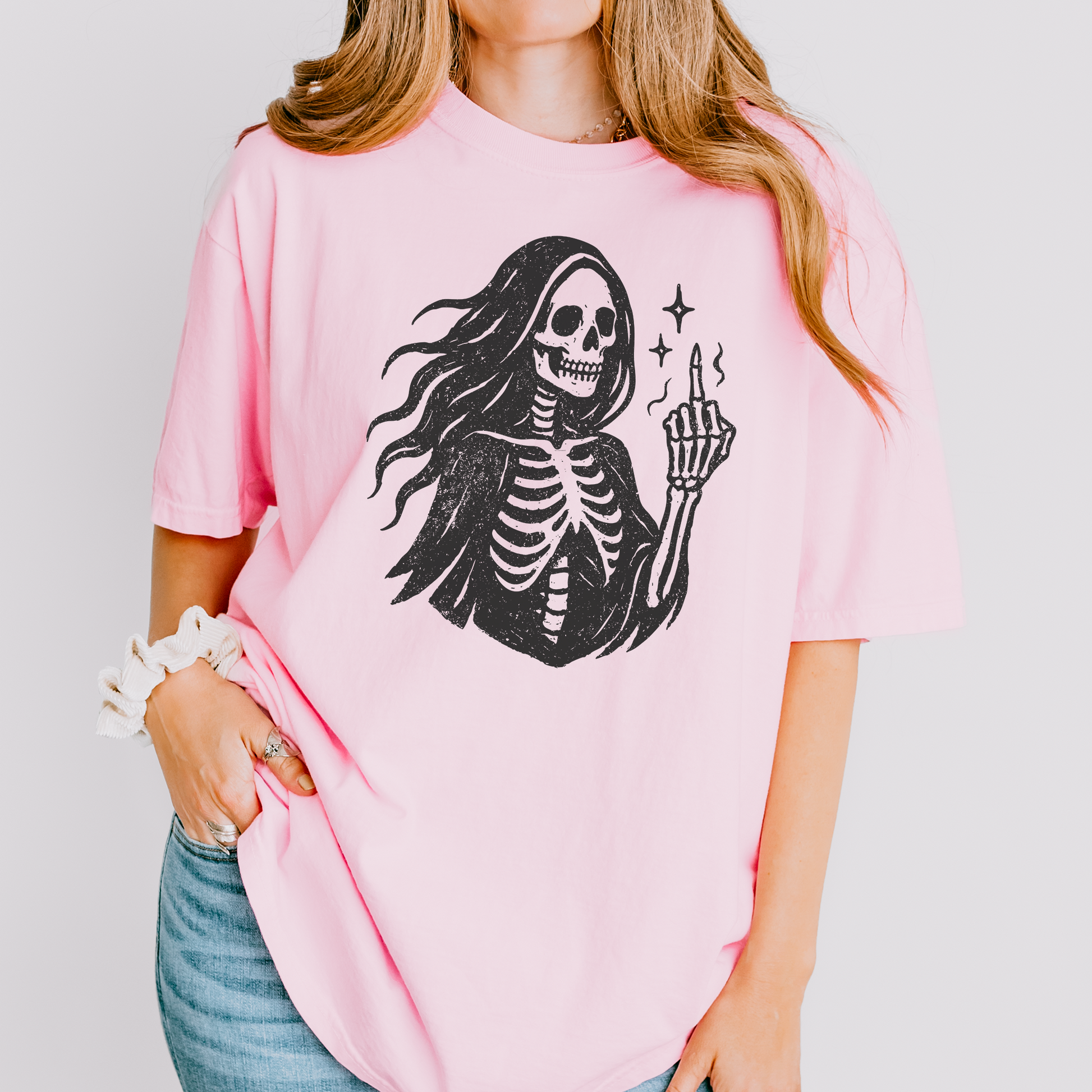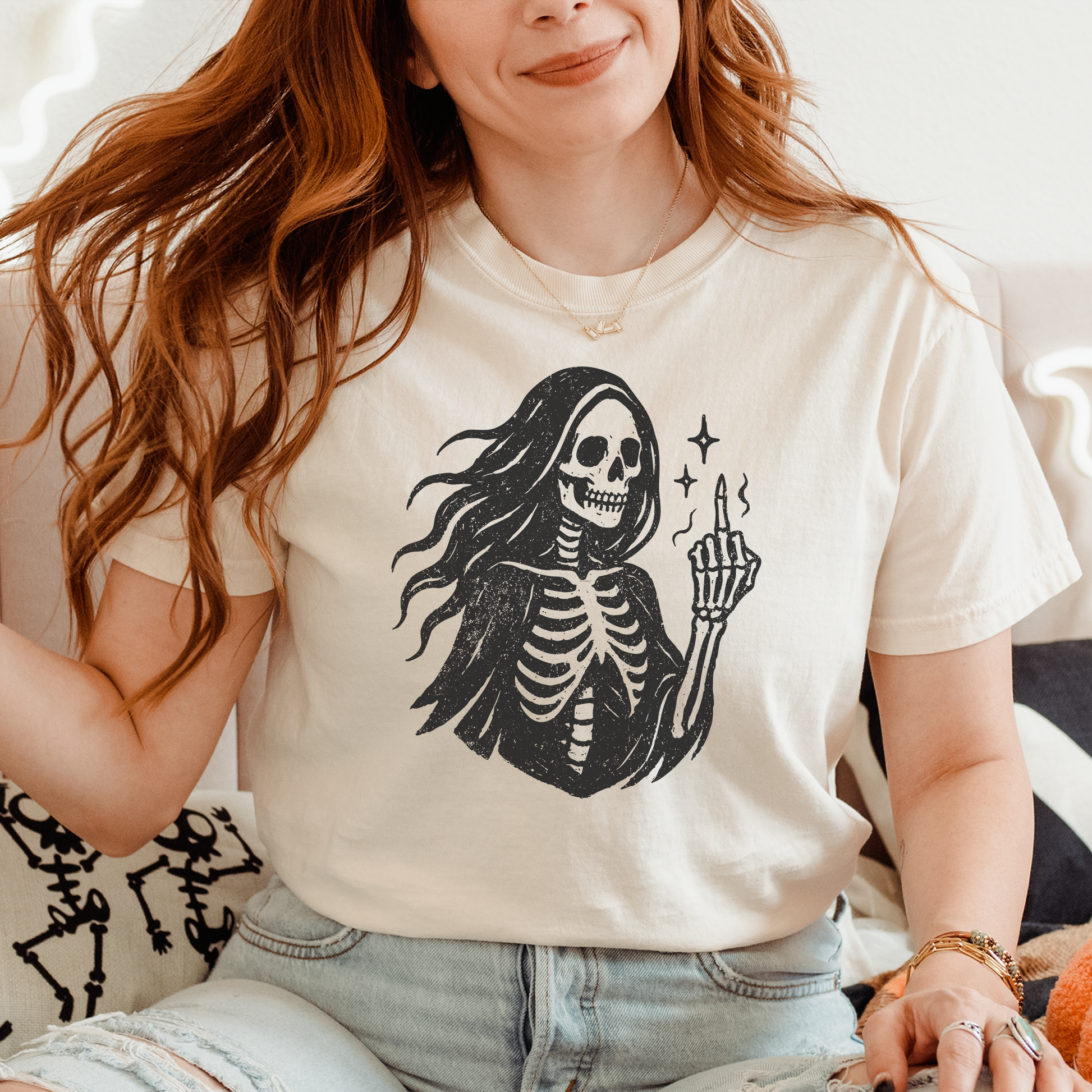 Meet your new favorite graphic tee: bold, sassy, and unapologetically spooky. Featuring a hand-drawn skeleton with flowing hair, throwing up the middle finger with a hint of sparkle ✨, this shirt is made for anyone who’s got a little witchy attitude and zero time for nonsense.