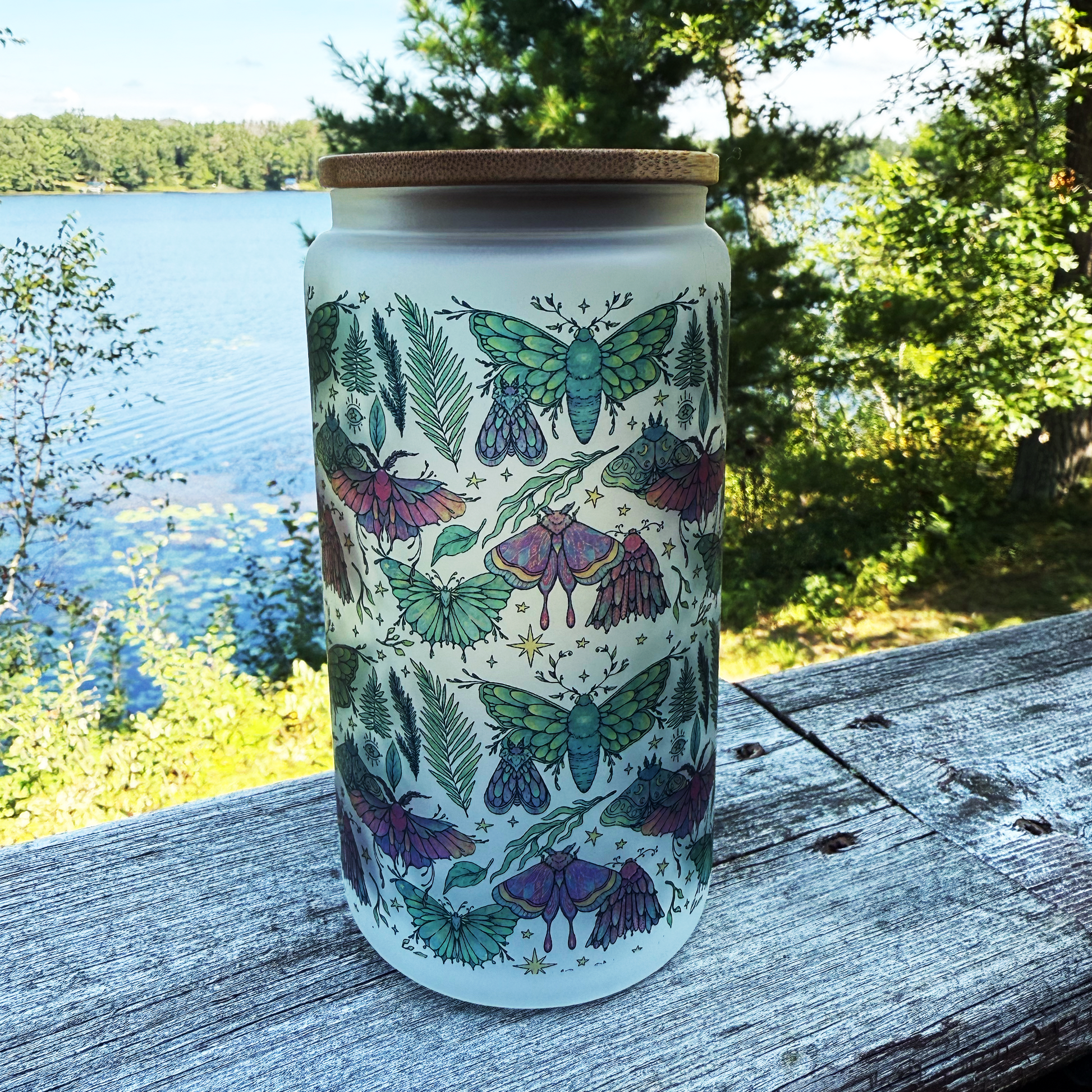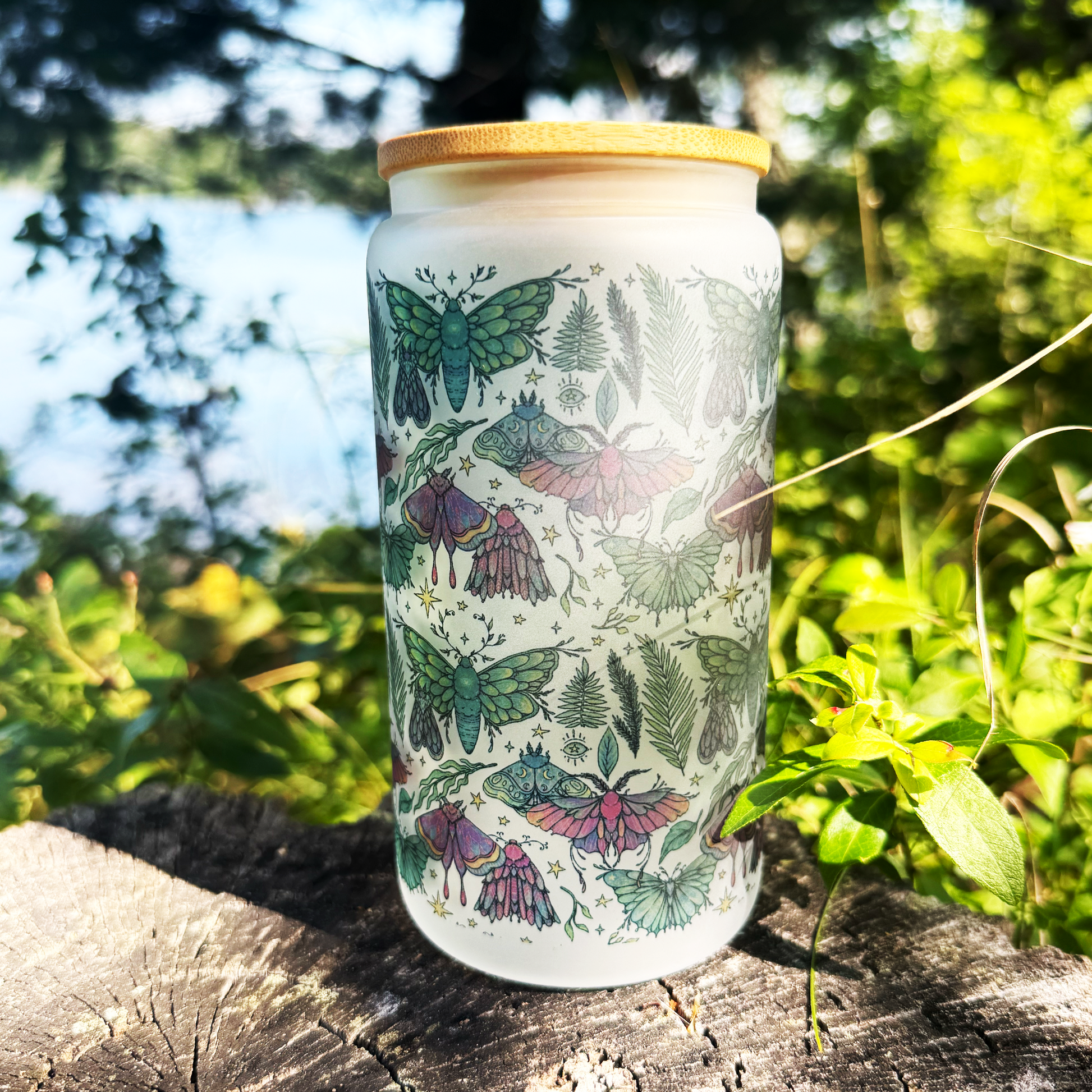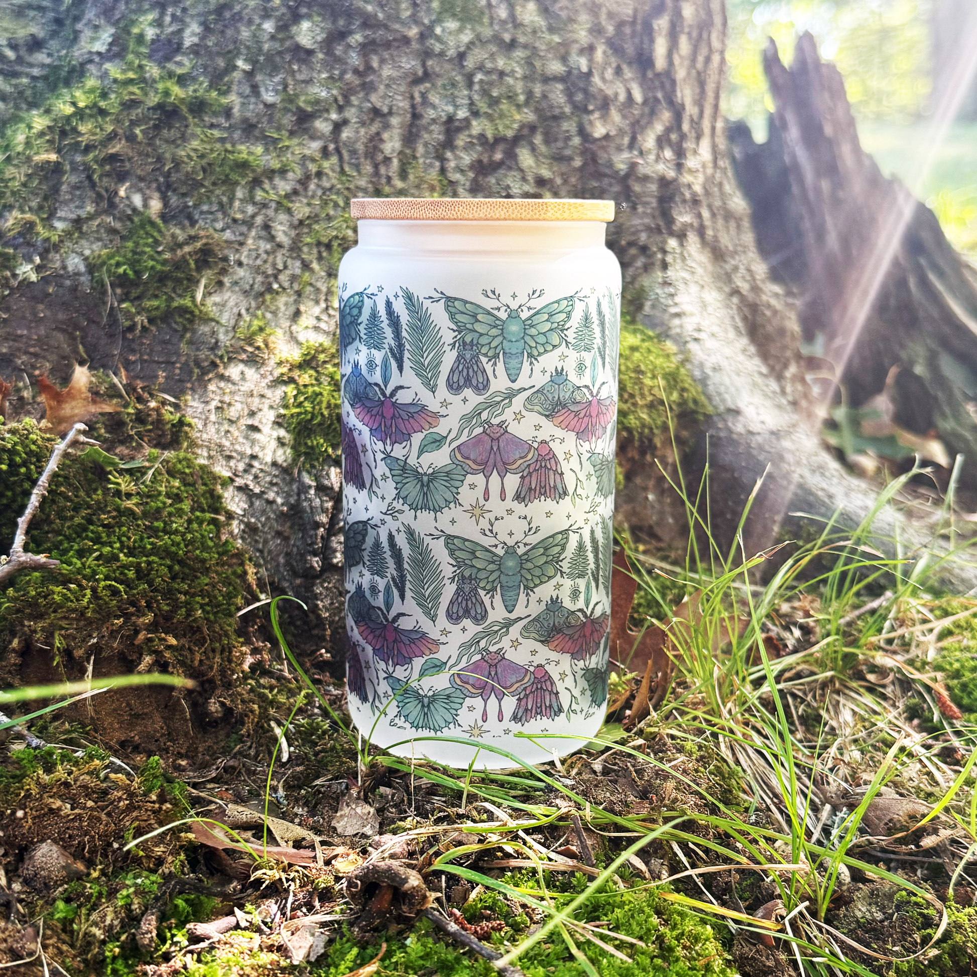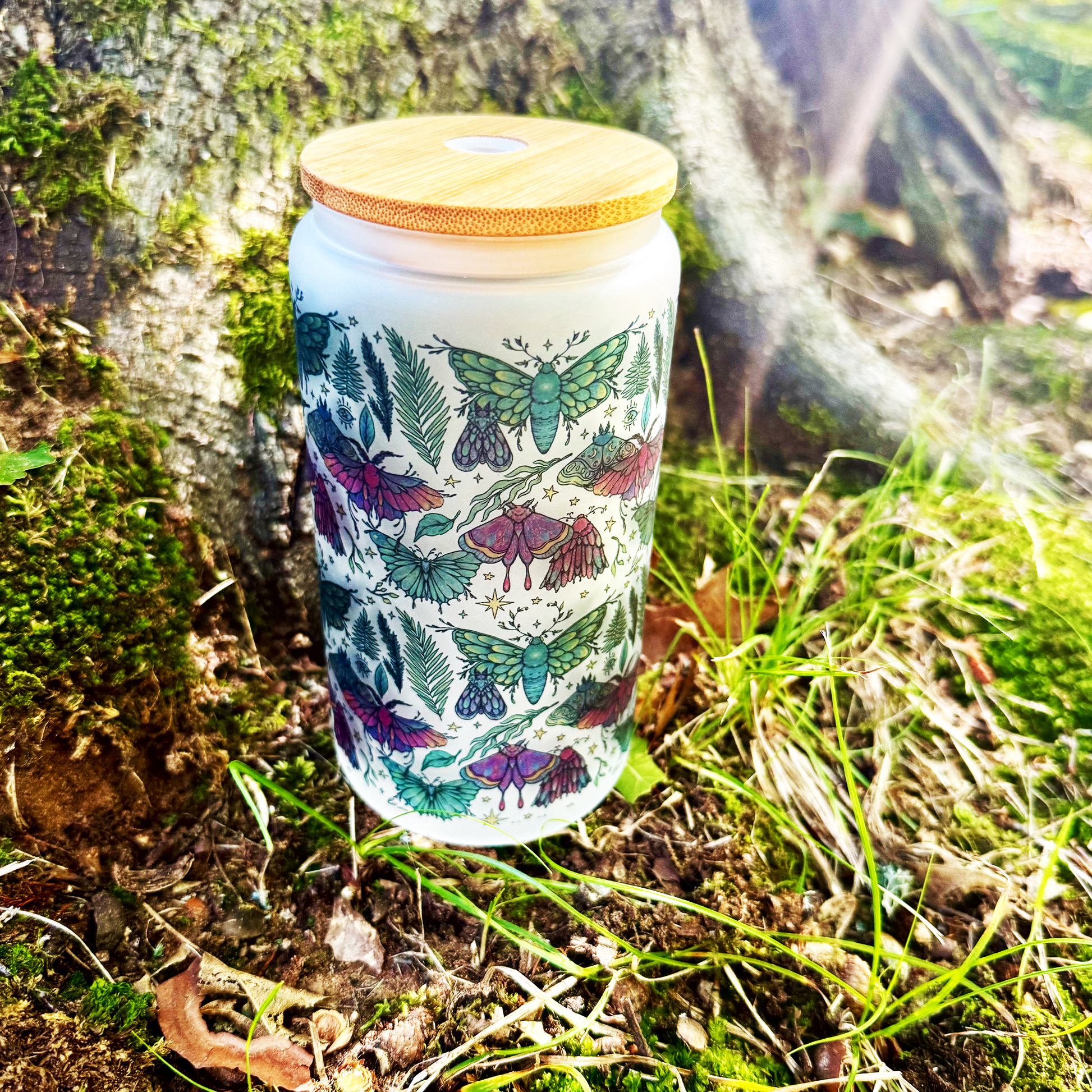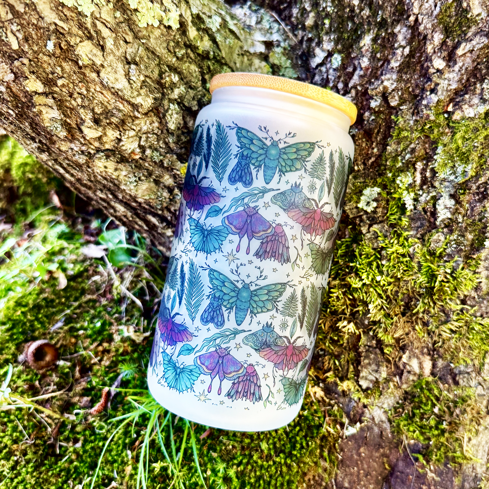 Magical frosted glass cup with witchy moths + ferns. Comes with bamboo lid + reusable straw. 16 oz capacity — perfect for iced coffee, tea, or your favorite witchy brew. A mystical gift for moth lovers and witchy souls.