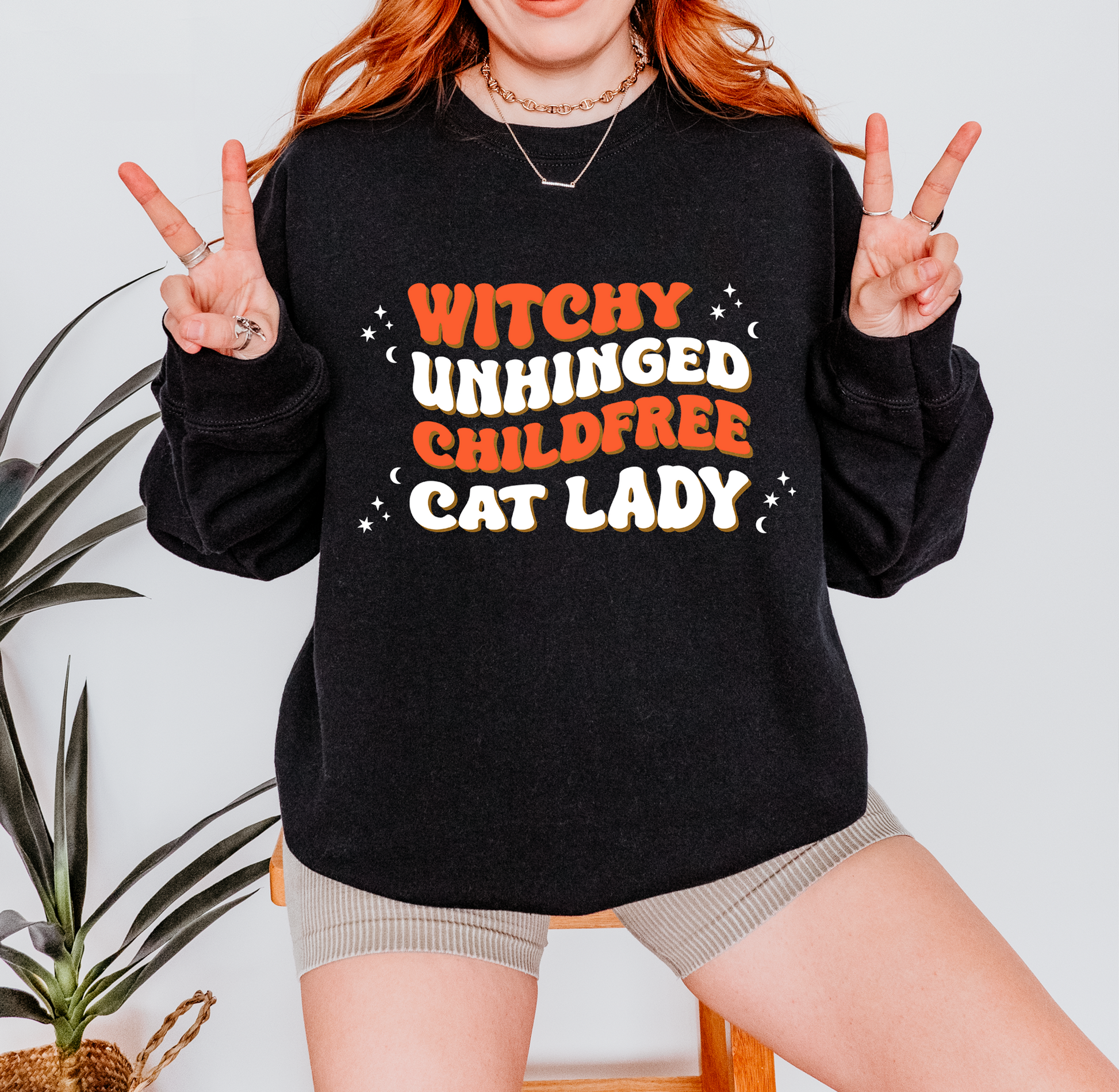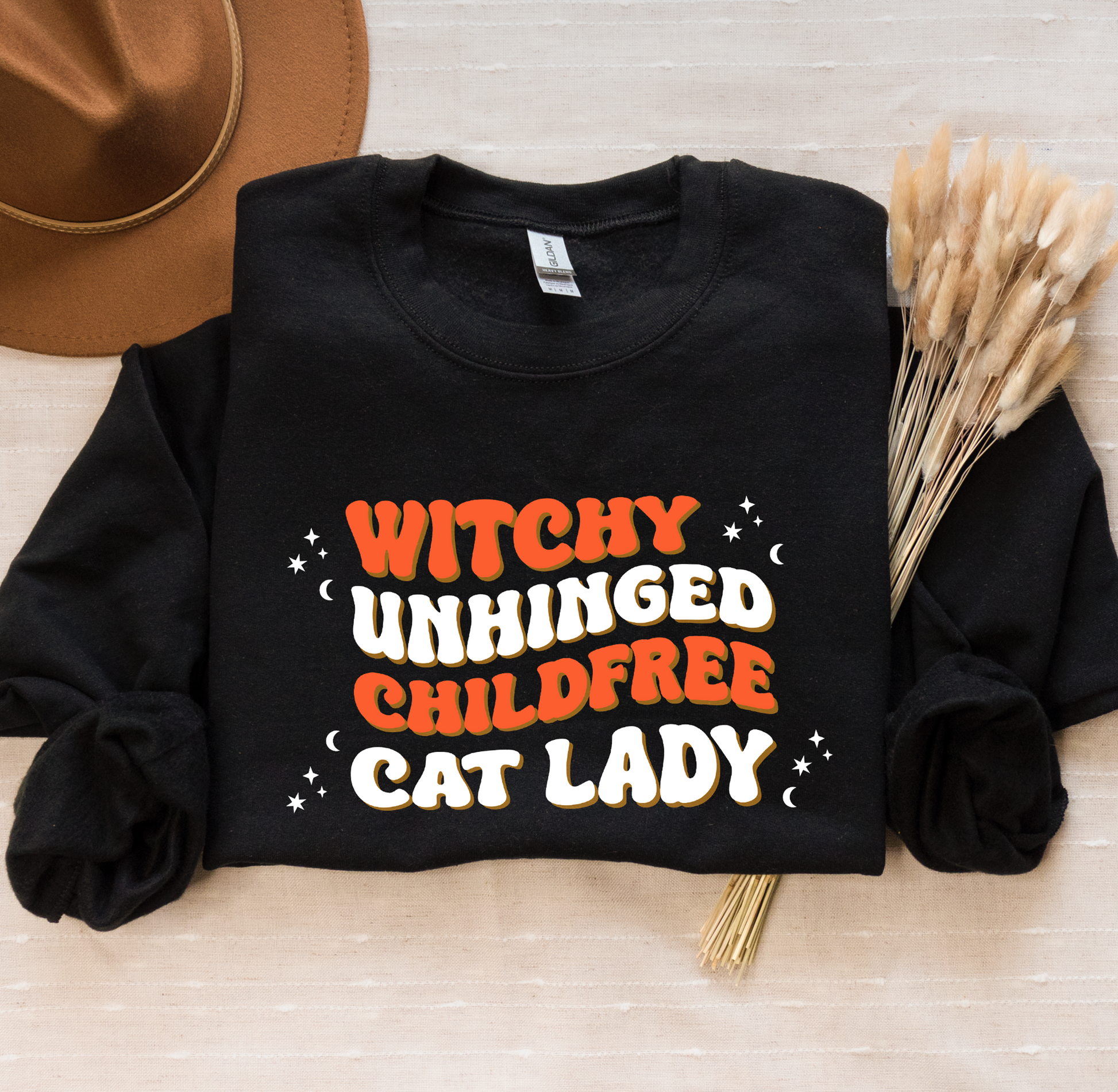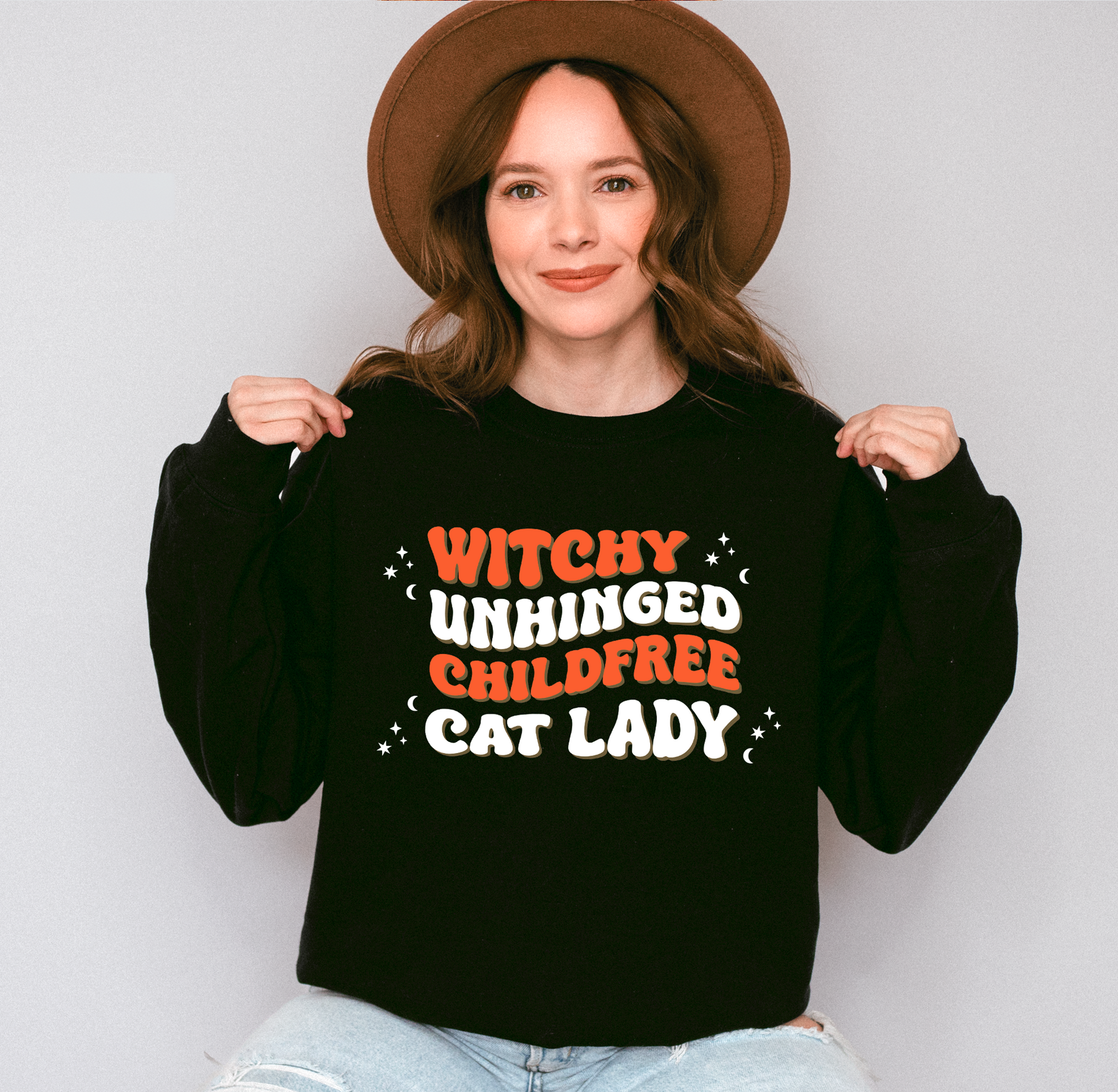 So, don your witch's hat, embrace your "unhinged" spirit, and venture forth adorned in our enchanting sweatshirt – because every witchy, childfree cat lady deserves to bewitch the world while staying fabulously cozy! ✨🐱