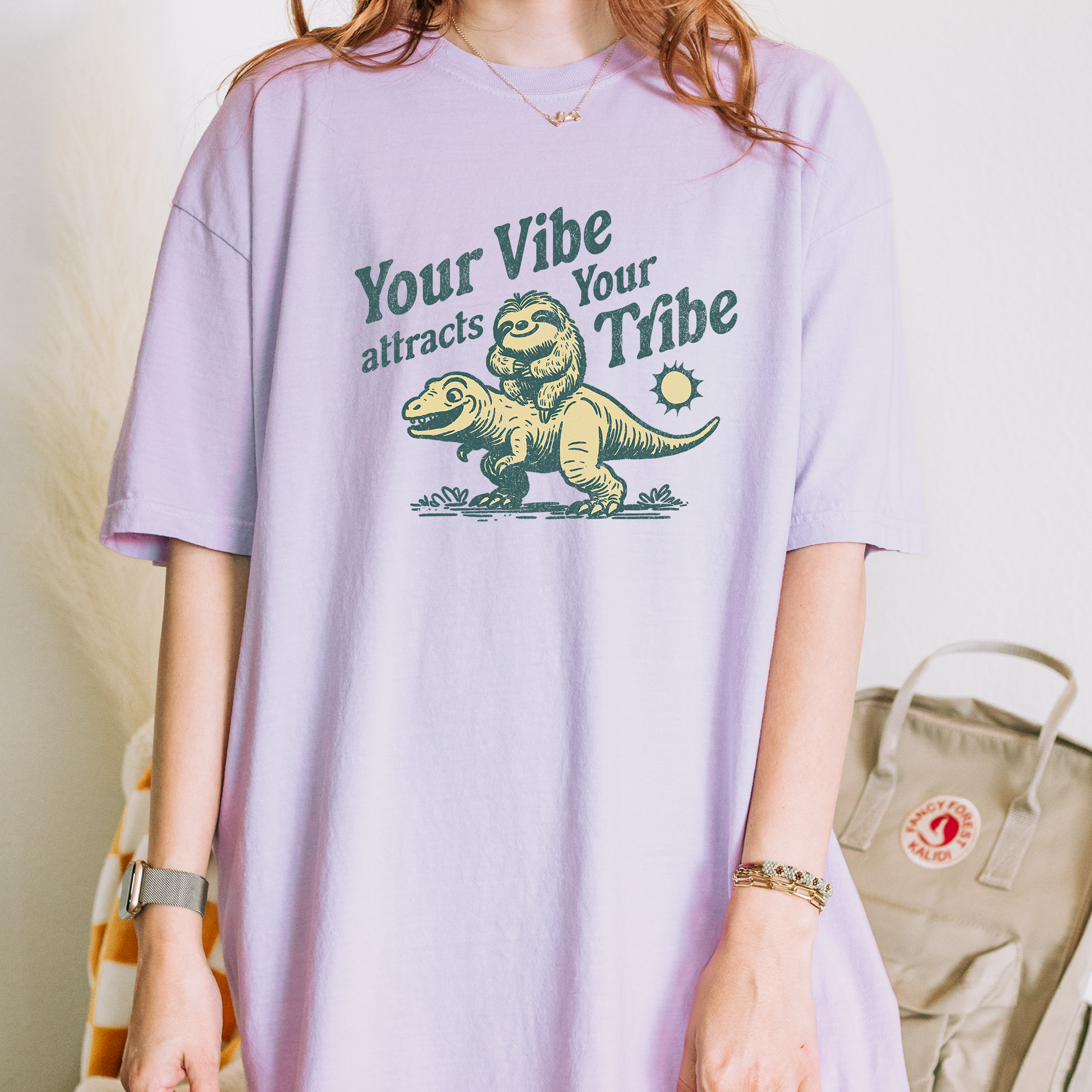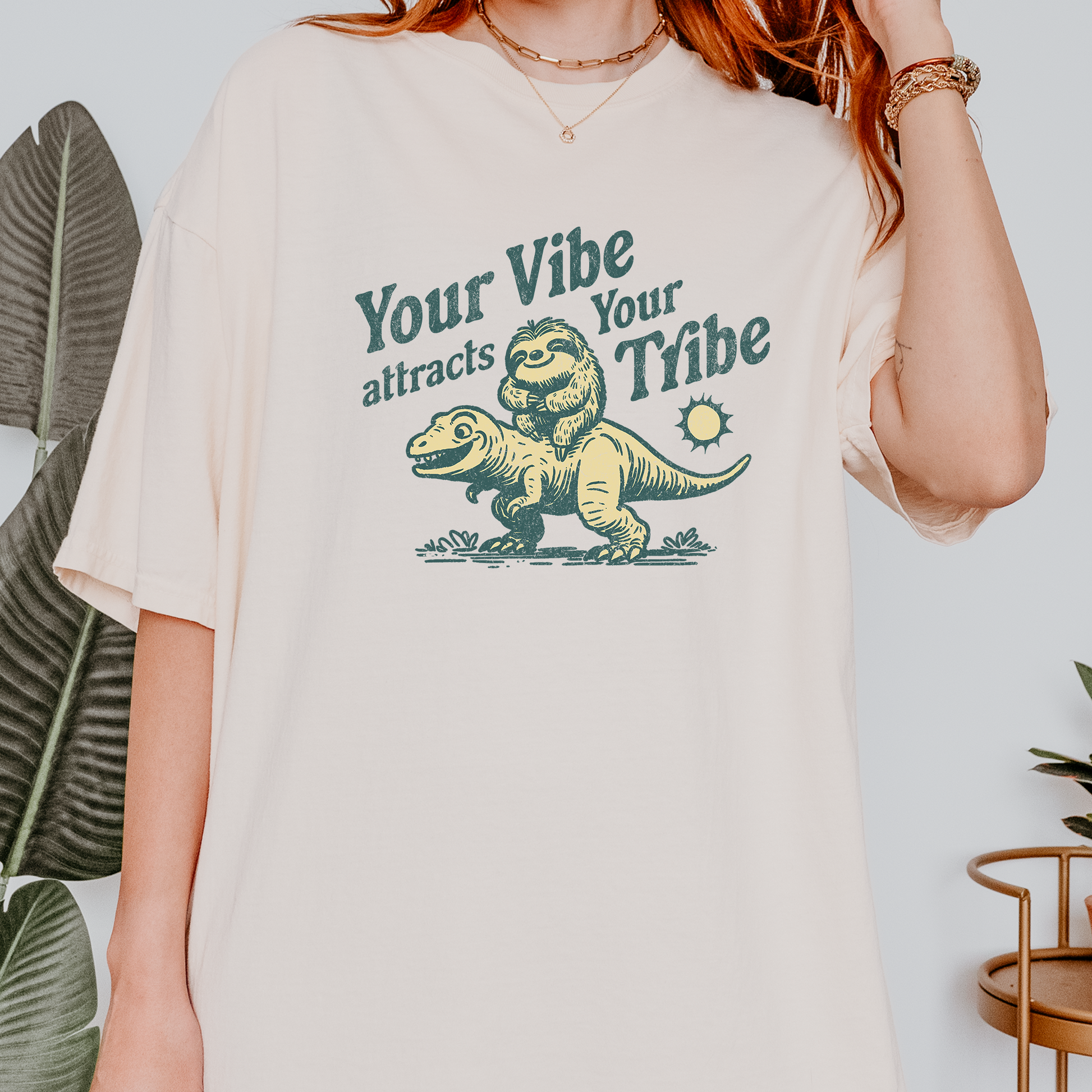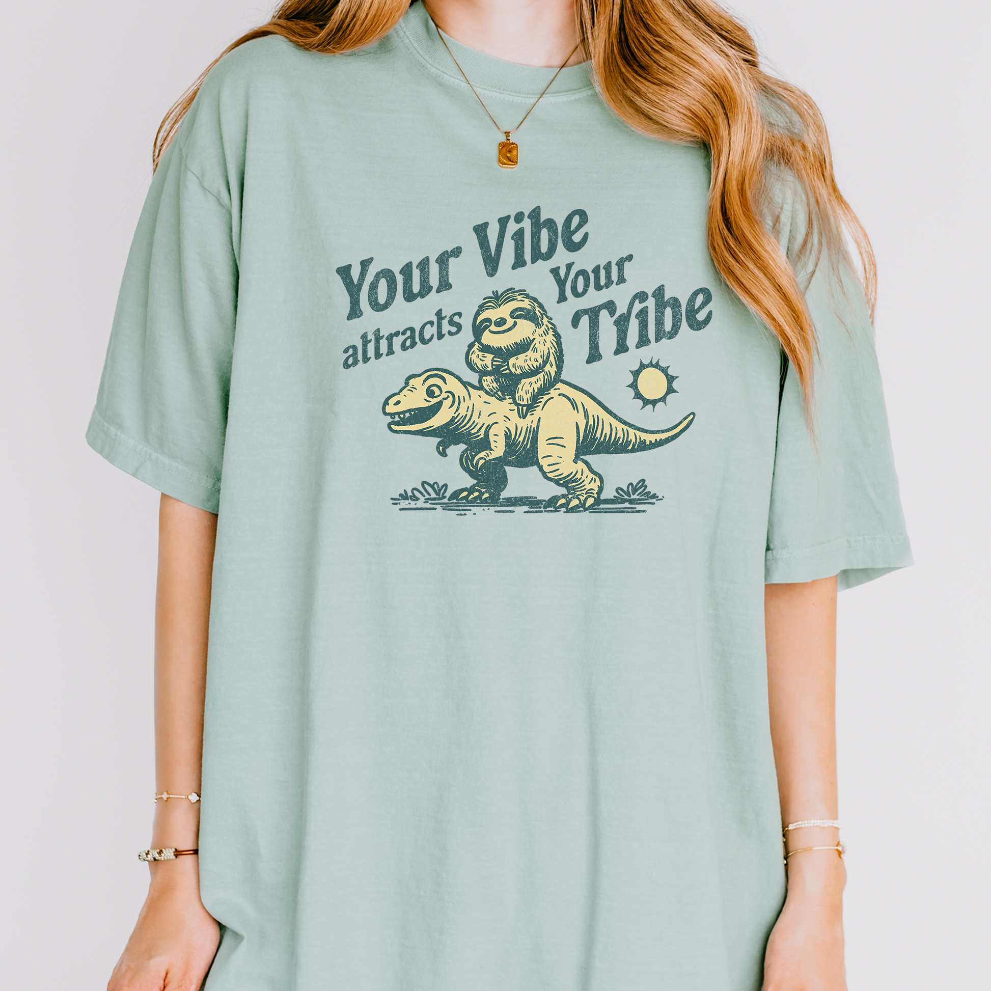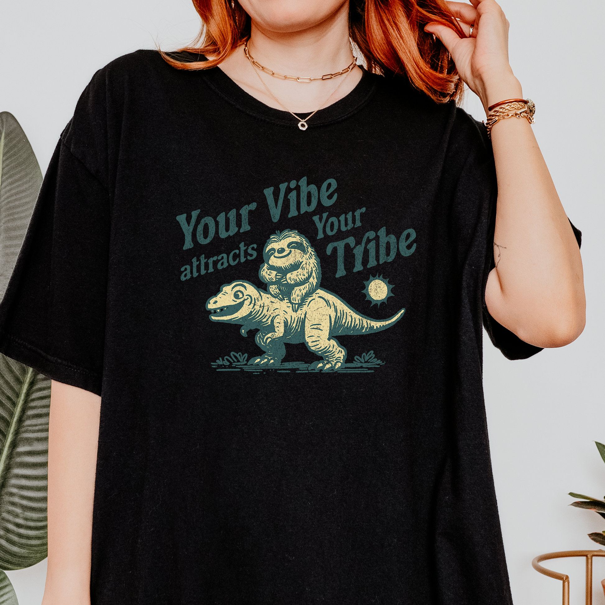 Your vibe attracts your tribe… and your tribe definitely includes this sloth-riding-a-dinosaur masterpiece! 🦥🦖✨ Whether you’re a laid-back adventurer, a dino lover, or just someone who appreciates a little retro-inspired fun, this shirt is for you!